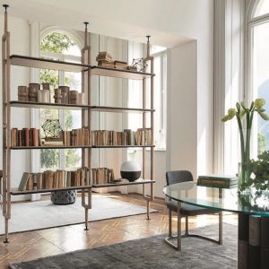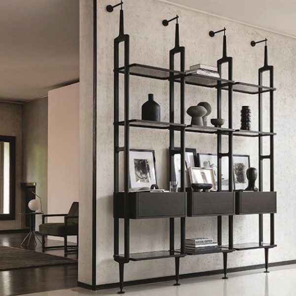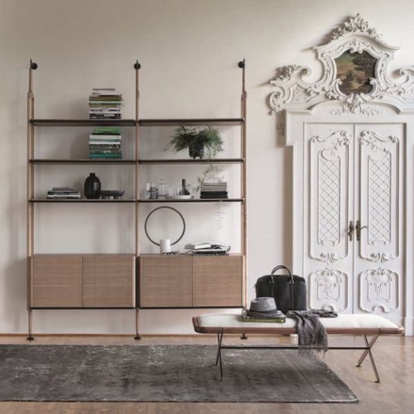 The Porada Aria bookcase is a contemporary take on a classic look, with storage elements supported by vertical solid wood columns mounted to the wall or ceiling. Aria is composed of a mixture of shelves, door or drawer units across a choice of six styles. Choose from a selection of natural or stained ash wood finishes. Depth 40cm.