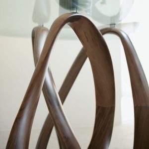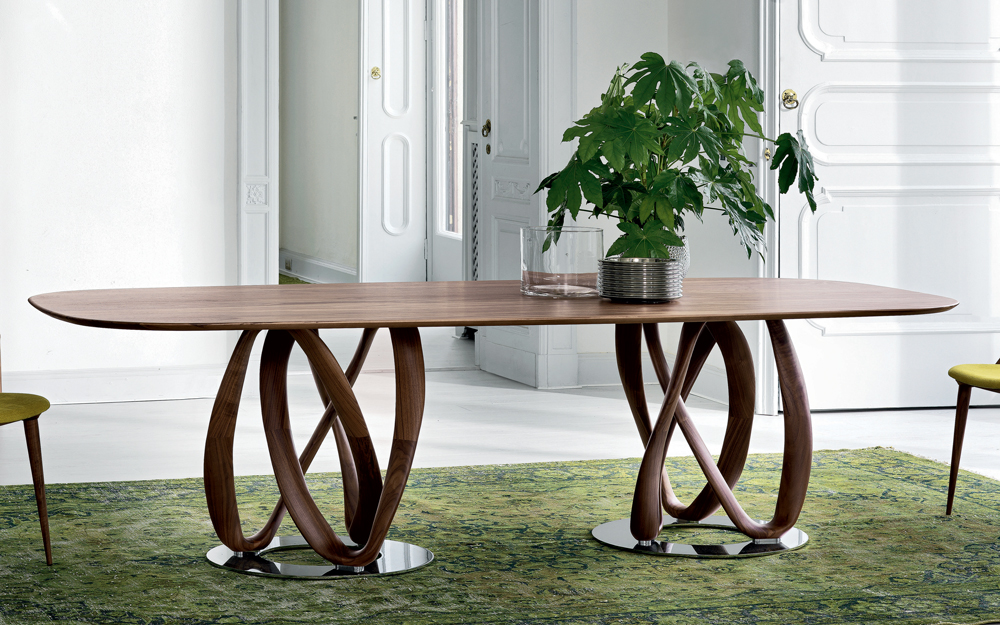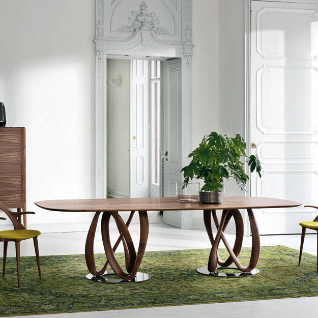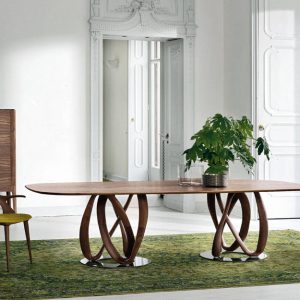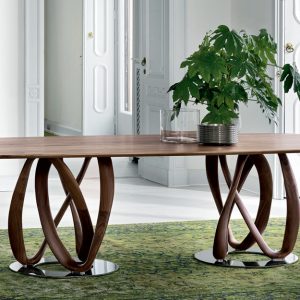 The Porada Infinity features a statement sculptural looped frame supporting a canaletto walnut wood top, available in different shapes and a variety of sizes. The frame is completed with a metal base plate in a choice of finish.