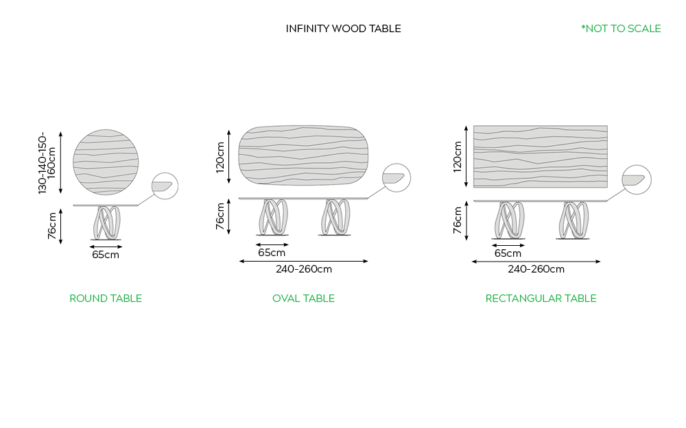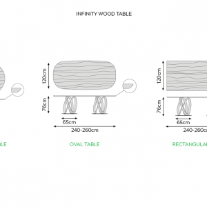 Round – Dia: 120cm H: 75cm, Round – Dia: 130cm H: 76cm, Round – Dia: 140cm H: 76cm, Round – Dia: 150cm H: 76cm, Round – Dia: 160cm H: 76cm
