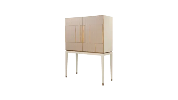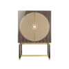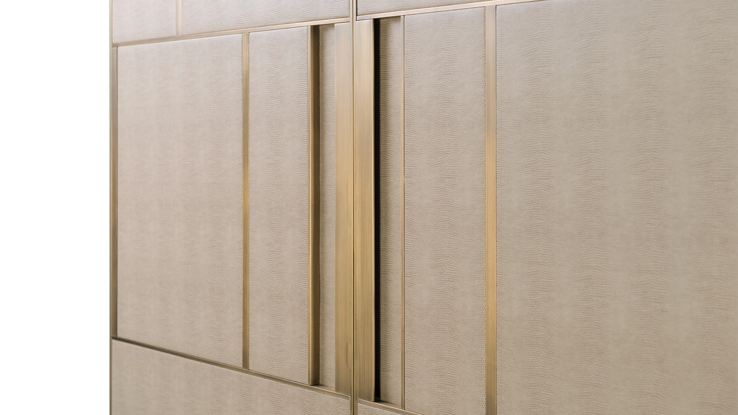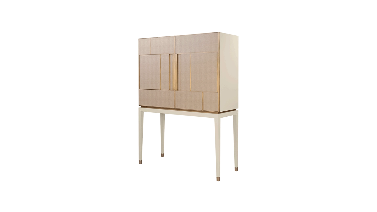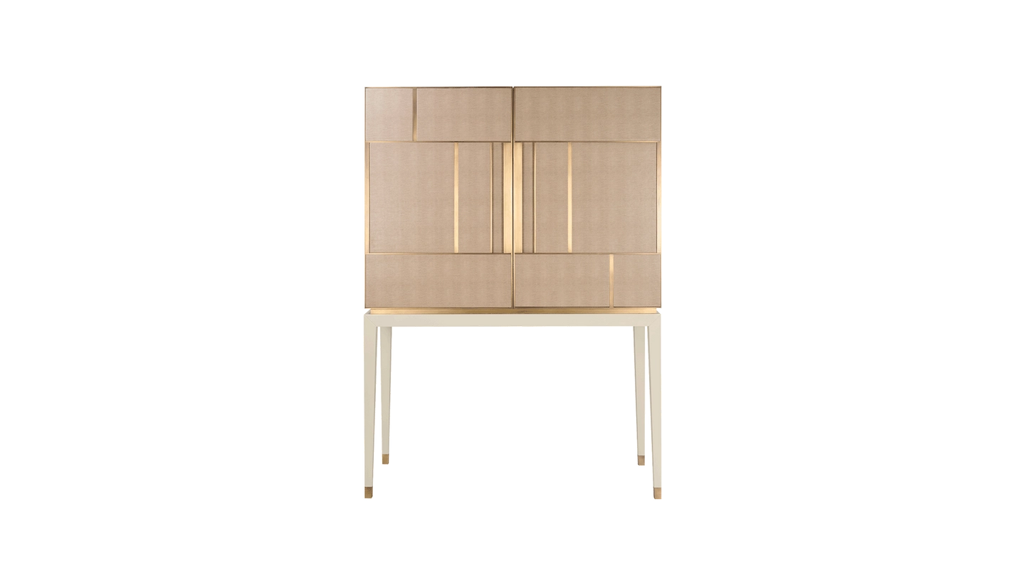 A chic way to add a geometric sensibility to your space, the DIDOT tall cabinet’s double doors feature brushed brass inlaid with luxurious panels of faux-animal skin. Inside a suede-lined drawer provides compartmental storage while a bronze mirror back adds glamour.