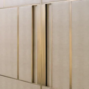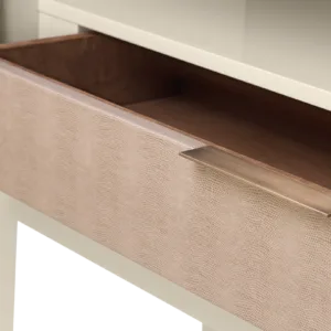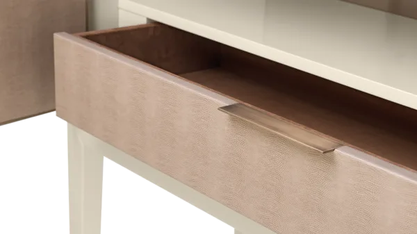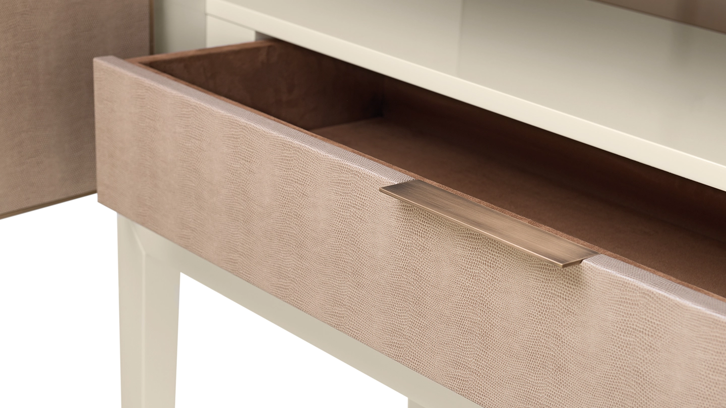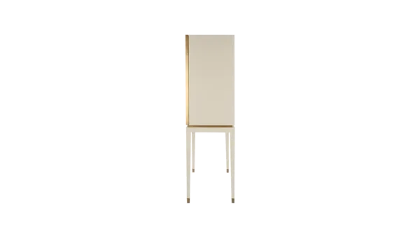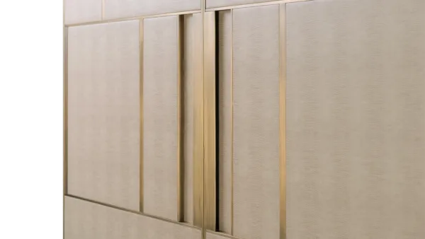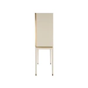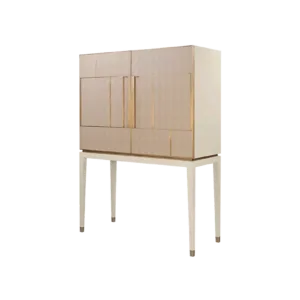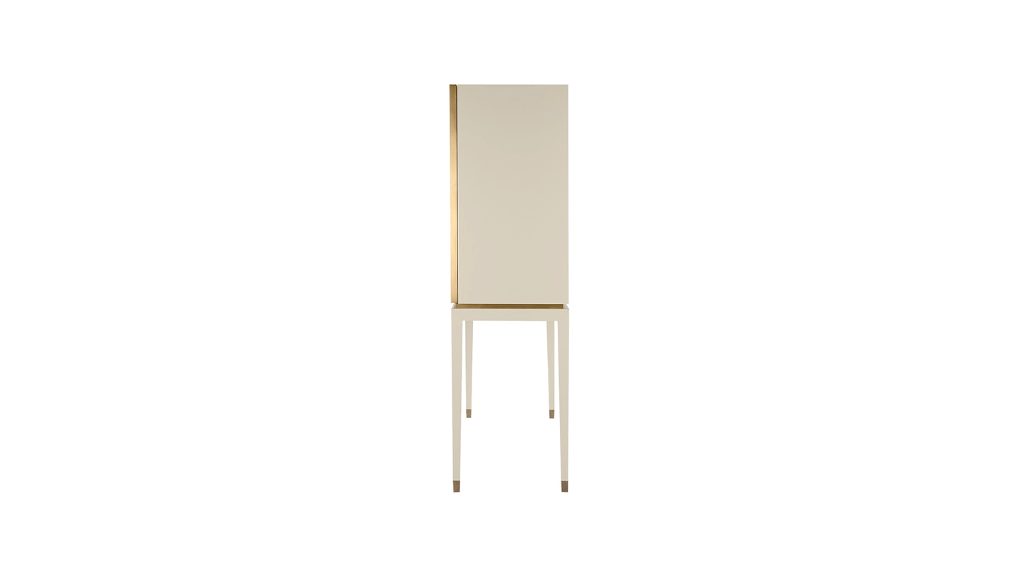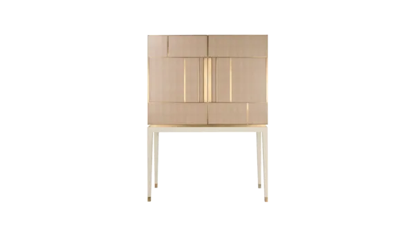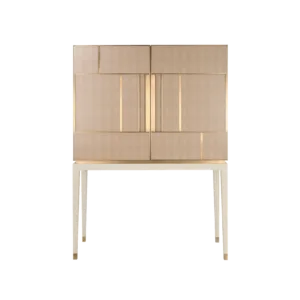 A chic way to add a geometric sensibility to your space, the DIDOT tall cabinet’s double doors feature brushed brass inlaid with luxurious panels of faux-animal skin. Inside a suede-lined drawer provides compartmental storage while a bronze mirror back adds glamour.