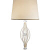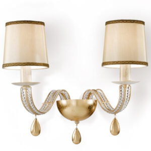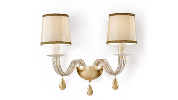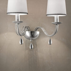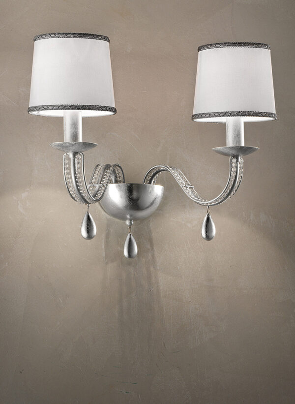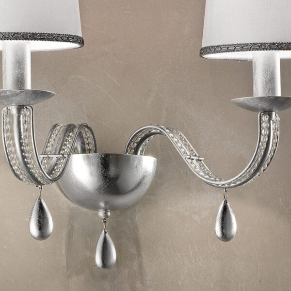 Metal frame decorated with transparent glass beads. Shantung fabric lampshades. Leaf pendants.
