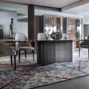 Rectangular table with top in inlaid Tasmanian curly Eucaliptus veneer with high gloss polyester finish. Fixed wooden inlay beveled top, base in combination of satin grey nickel stainless steel and Tasmanian curly Eucaliptus veneer with high gloss polyester finish.