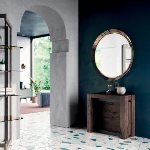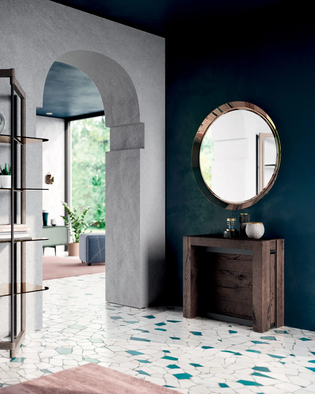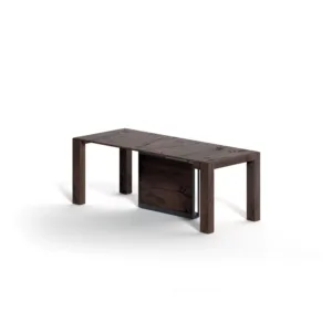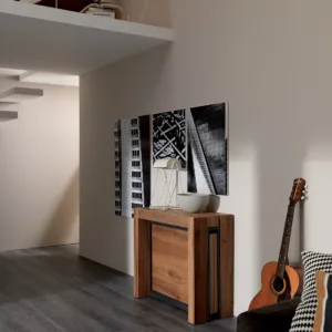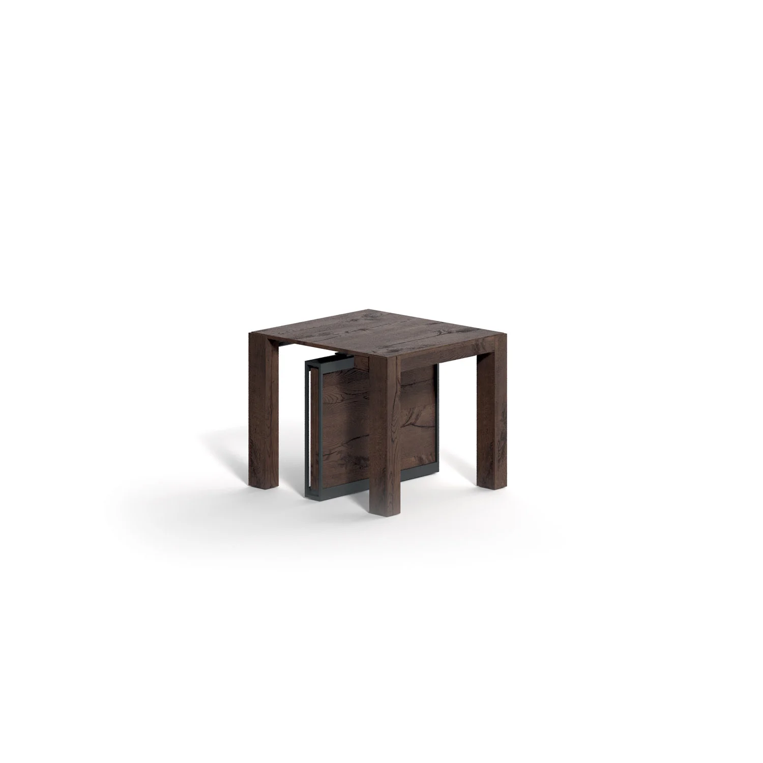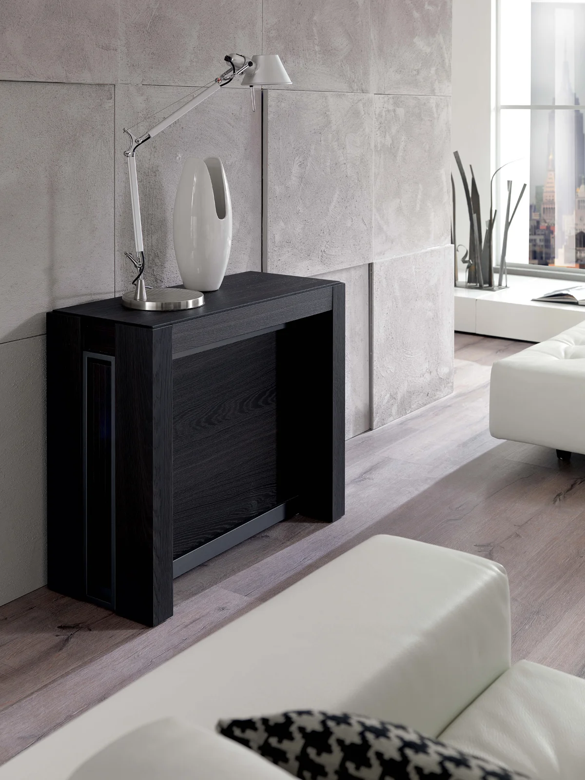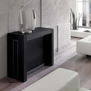 Extendable wooden console table with 4 extensions placed in the structure. Aluminium telescopic mechanism, central swiveling leg that supports the mechanism while open. Wheels for a better movement.