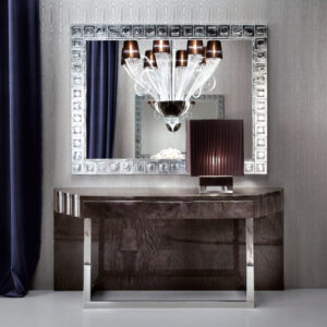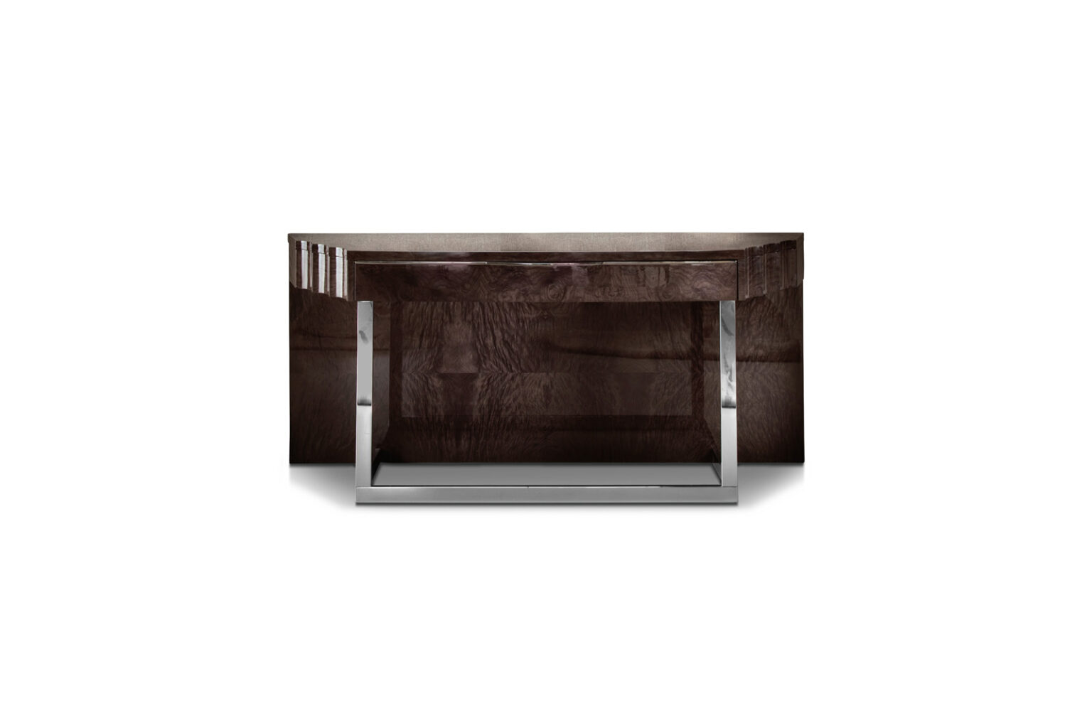 Consolle with combination of moka japanese tamo burl veneer in high gloss polyester finish and chrome stainless steel front legs. 2 full extension drawers w/bottom in velvet fabric.