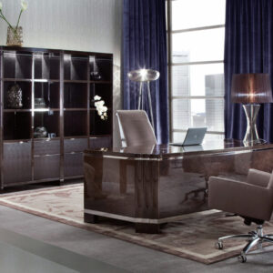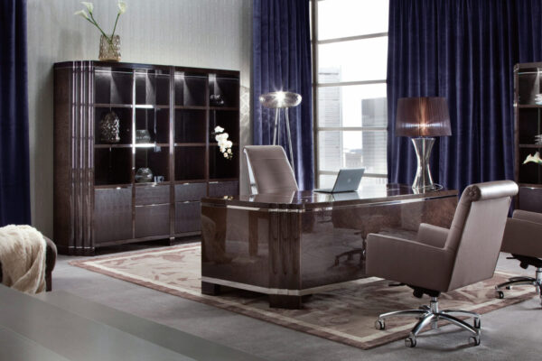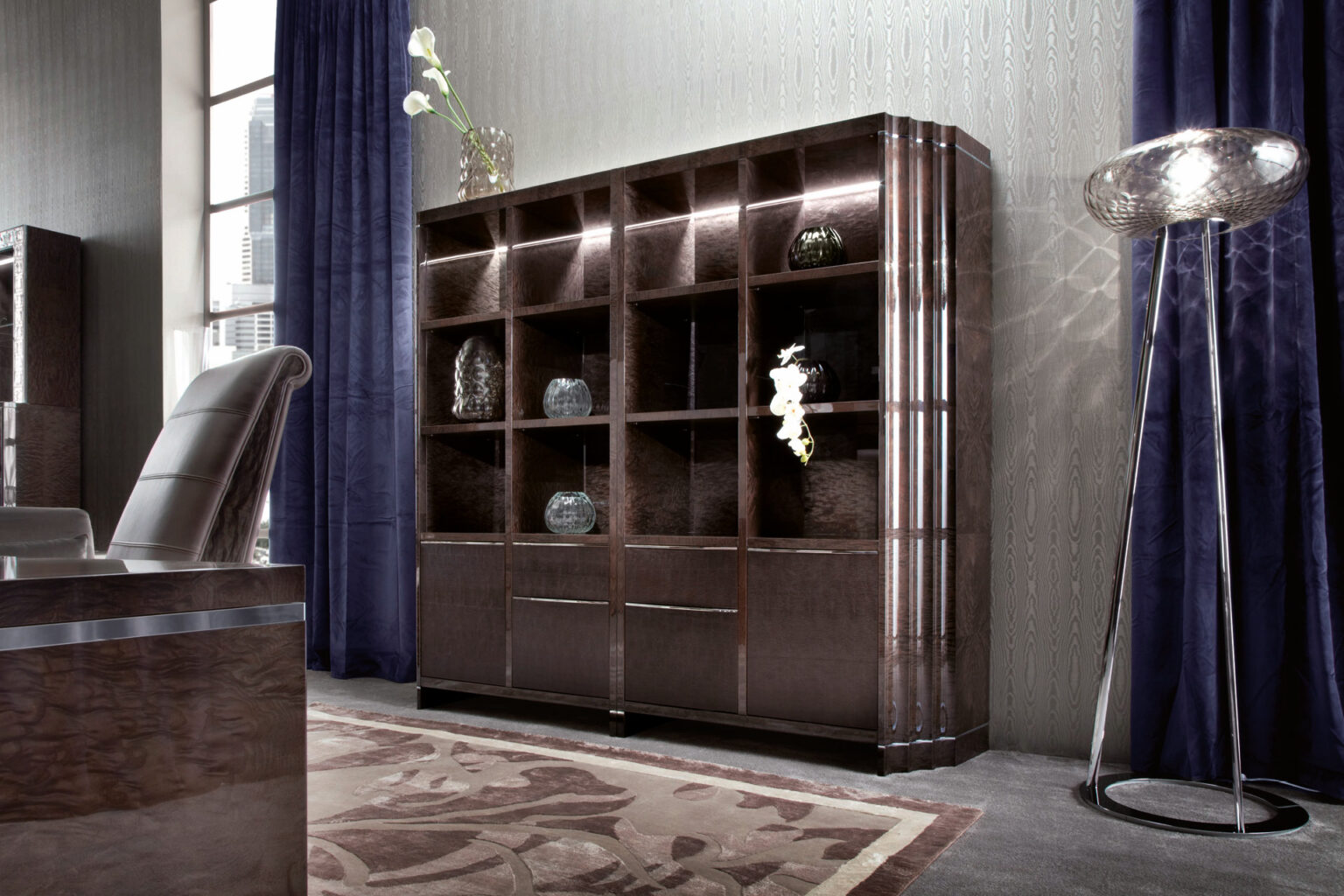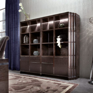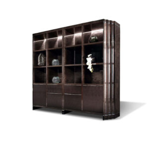 Double Bookcase finished in moka japanese tamos burl veneer in high gloss polyester. 8 wooden shelves and special led light sytem including touching switch. 2 doors, 2 small drawers and 2 file drawers covered with “Moresco” leather.