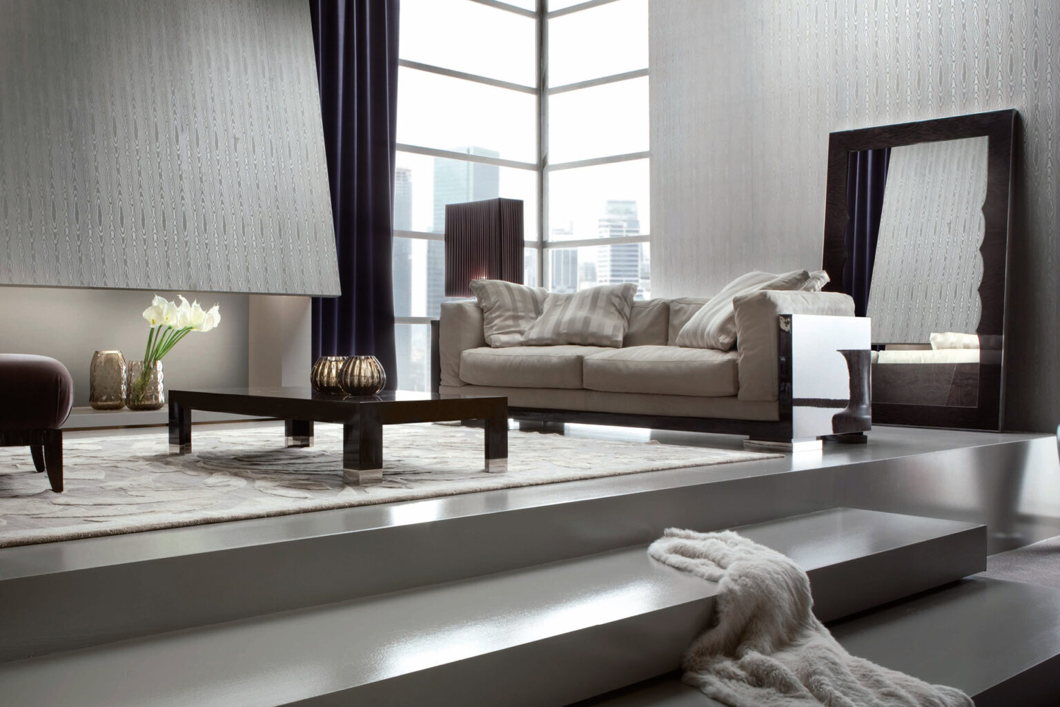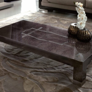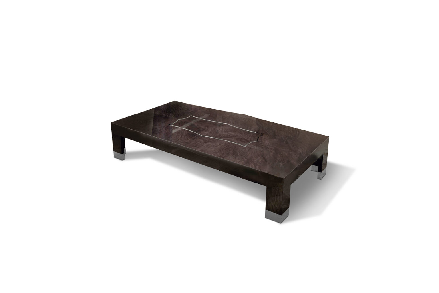 Rectangular cocktail table in moka japanese tamo burl veneer.