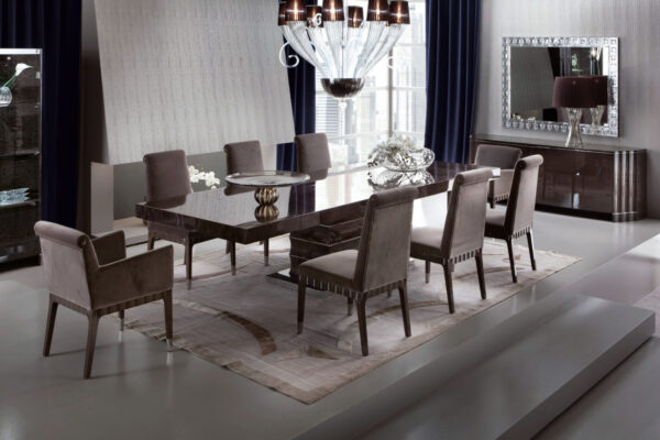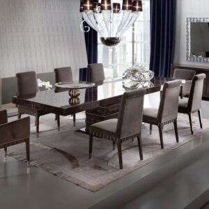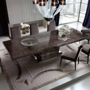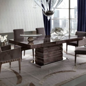 Rectangular table in moka japanese tamos burl veneer with high gloss polyester finish. Chrome stainless steel top inlay. 2 refractory leaves of cm. 50 each. Base in chrome stainless steel.