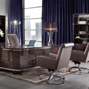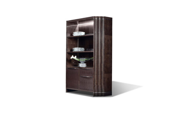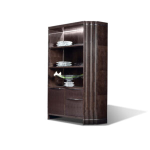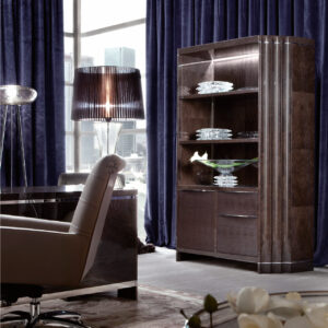 Single Bookcase finished in moka japanese tamos burl veneer in high gloss polyester. 2 wooden shelves and special led light sytem including touching switch.1 door, 1 small drawer and 1 file drawer covered with “Moresco” leather.