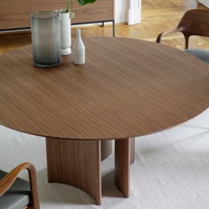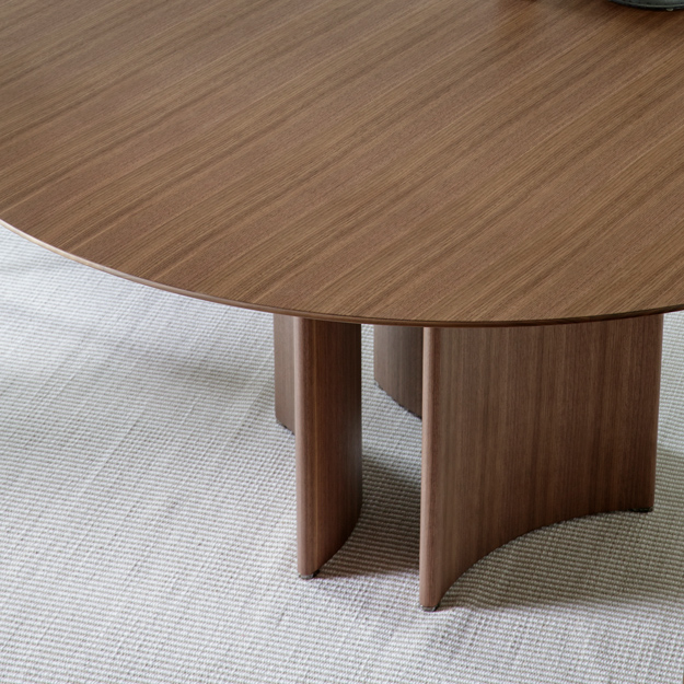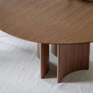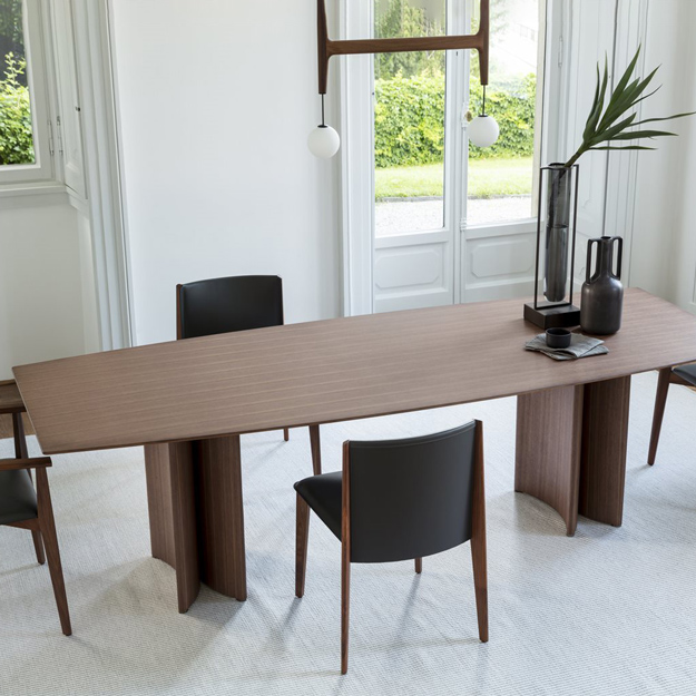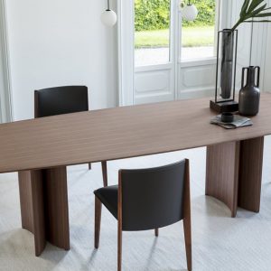 The Alan Wood Table is a stylish design in canaletto walnut wood featuring a base of two double crescent-profiled uprights, with metal feet details at the bottom. The top is available in several wood finishes and comes in either a rectangular or ‘barrel’ shape.
