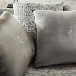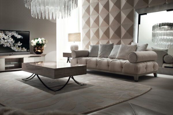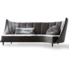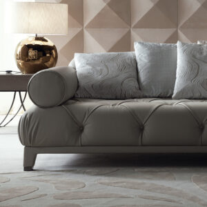 Masami sofa seats seat in polyurethane foam wrapped in down feather, 6 back pillows 100% down filling.Buttoned seat. Base in combination of leather and stainless steel in storm dark grey finish.