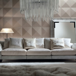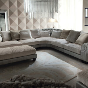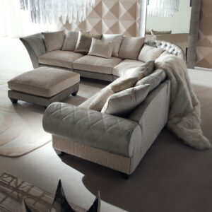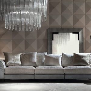 Yoko sectional sofa available in first grade leather, nubuk leather, lizard printed leather, velvet or suede fabric. Seat in polyurethane foam wrapped in down feather. Feet in stainless steel in storm dark grey finish.