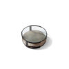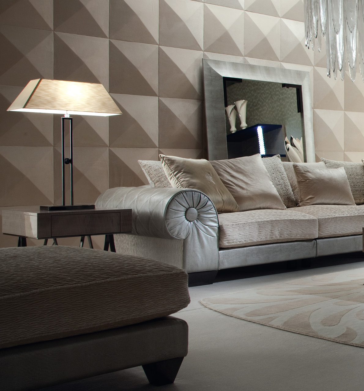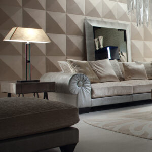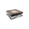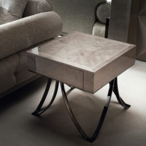 Square end table in tiger African sycomore veneer with high gloss polyester finish. White maple fine line inlay in the top. Base in stainless steel in storm dark grey finish. 1 full extension drawer w/bottom in silver lizard printed leather.