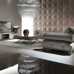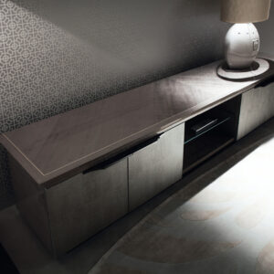Base for plasma T.V. unit in tiger African sycomore veneer with high gloss polyester finish. 4 doors in silver lizard printed leather and 1 open space. 1 center glass shelf and 2 lateral glass shelves. Base and handles in stainless steel in storm dark grey finish.
