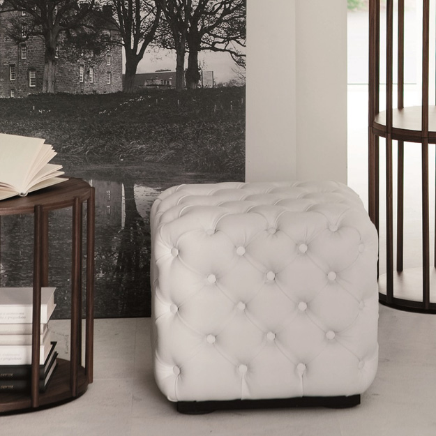 The Porada Alcide pouf features padded fabric or leather upholstery with intricate buttoned detailing. Available in three sizes.