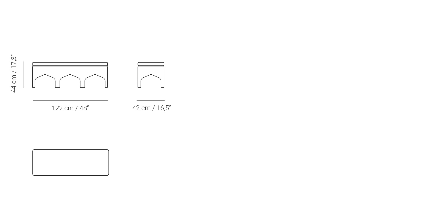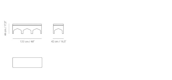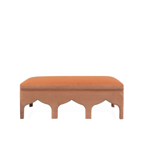 The original Almenara bench is a fantasy inspired by the Tales of the Arabian Nights. The legs have been fashioned in the shape of the traditional arches of Middle Eastern architecture and lined in fabric for extra warmth. The soft seat is also upholstered in fabric.