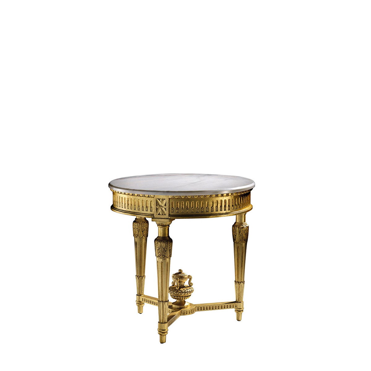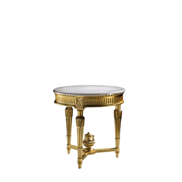 The classic Carmen side table is an elegant side table made of carved wood, with three tapered legs joined together by a wooden loop with an urn at the intersection. The top is in natural stone or marble. Available in a wide range of finishes.