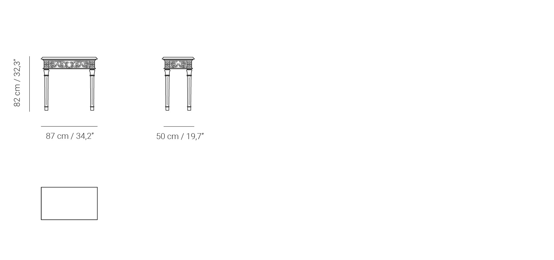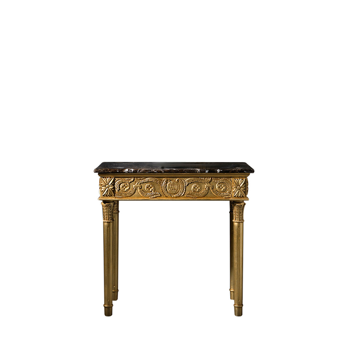 The Daniela side table is classical style. An ornately carved piece with a decorated frieze with nature motifs centered by a profile medallion within a laurel garland. Includes a marble or natural stone countertop.