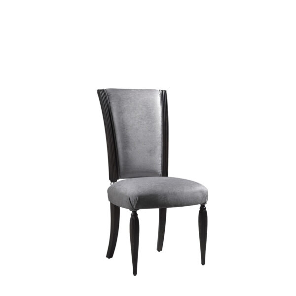 Deco is an elegant dining chair in the classical style. Its upholstered back rests on carved wooden balls and straight legs, contrasting with the front tapered legs.