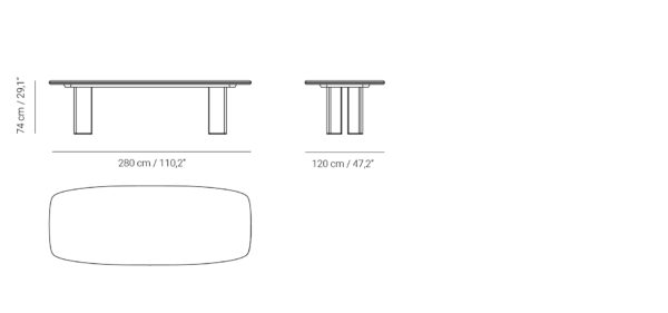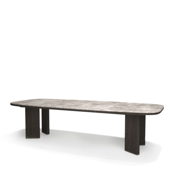 The Decorte dining table boasts a rectangular marble top with gently rounded edges, supported by four elegant legs strategically placed at an angle. With its dimensions of 280x120cm, this table offers ample space to seat 8 to 10 comfortably, flawlessly blending functionality and style in a design that lends a sophisticated air to the dining room.