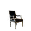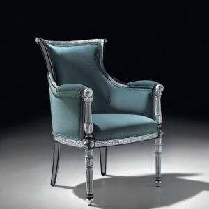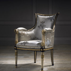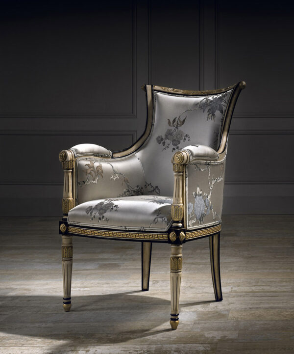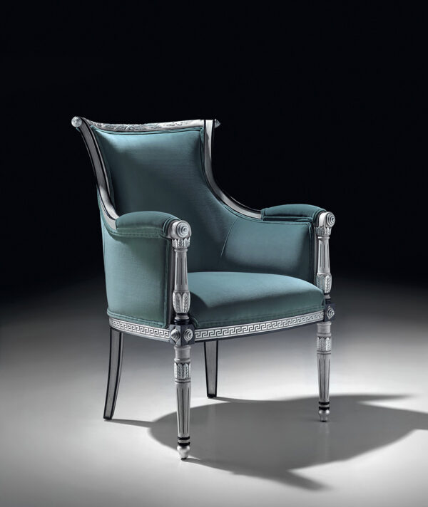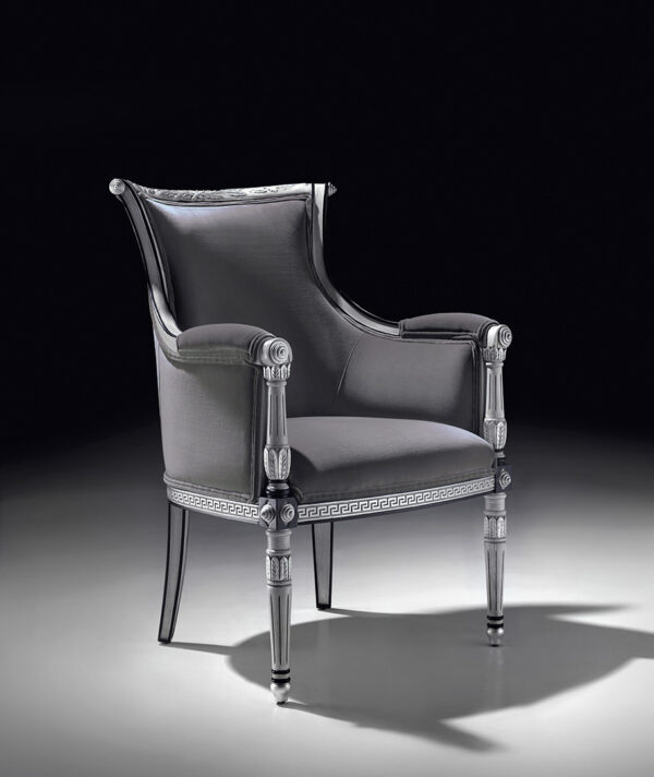 The upholstered Emili armchair in the traditional style is made of carved beech wood. The wood carved frieze in a leaf design at the top and in a classic design surrounding the seat are features to note.