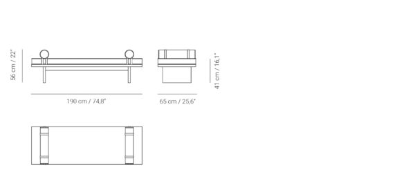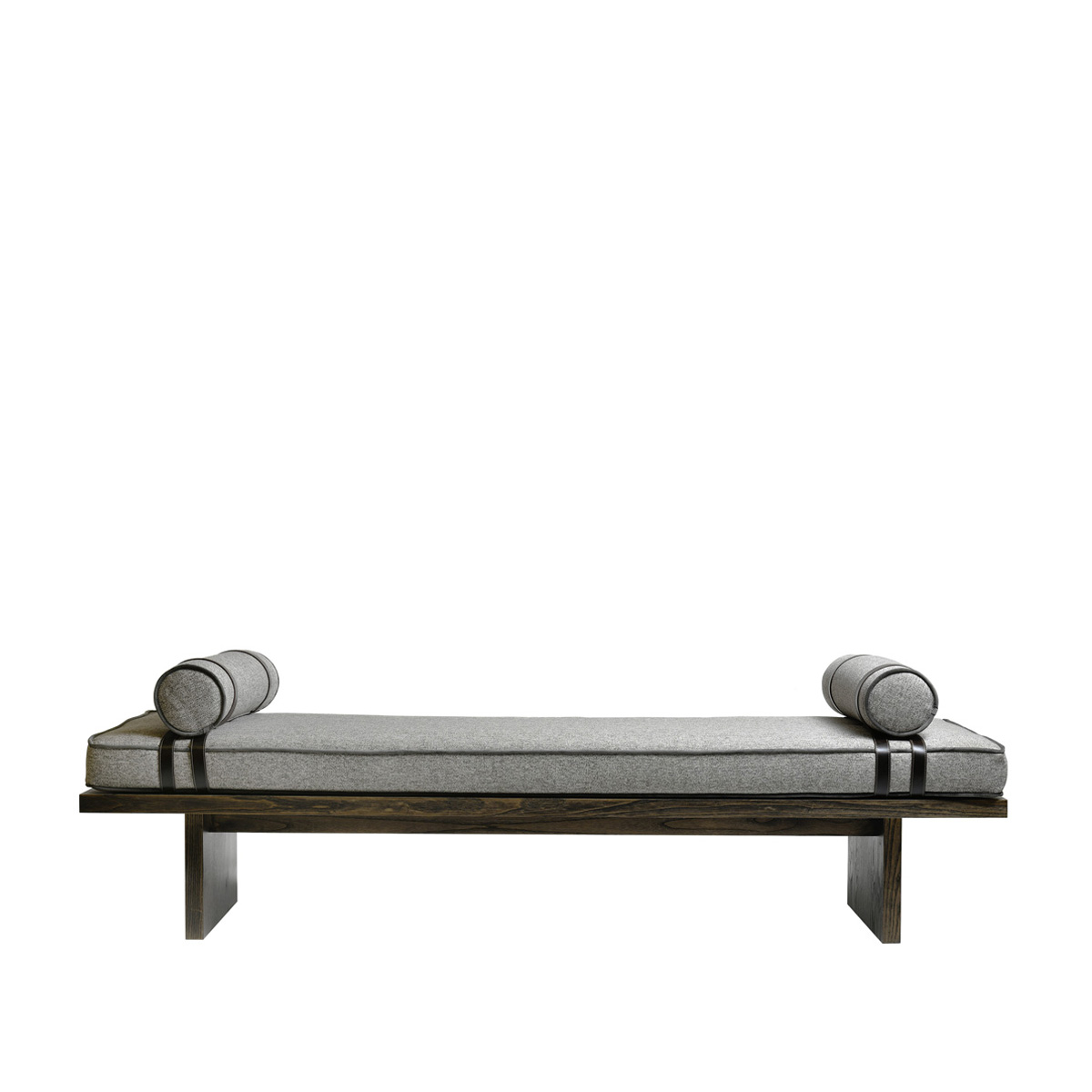 A solid structure finished in ash wood with a soft cushion for comfort. Includes two bolsters attached to the bench with brown leather straps. Customizable in a wide range of upholstery and a careful selection of finishes.