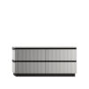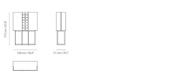The upper unit is divided into three sections, with 7 central drawers flanked by large doors and detail leather handles. The interior is upholstered in fabric with glass shelves and offers ample storage space for your essentials. It rests on an ultra- modern chrome base. Sleek, chic perfection.
