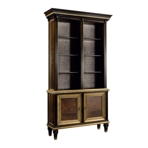 Laura unit shelves and doors. Elegant, classic style piece with high-end finishes. The beauty of olive tree root, available in 5 different tones, framed in a beech wood structure in 6 different finishes. The ornamental details come in 3 different finishes.