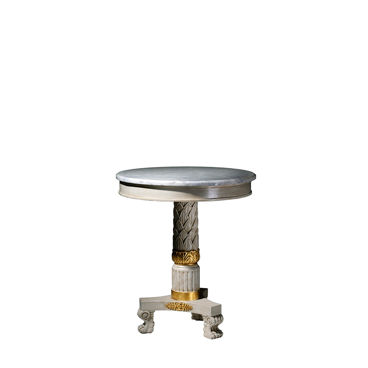 The classically styled Magda side table is a practical piece of furniture that also enhances the décor of the room. The wooden base is formed by a pedestal leg in the shape of a carved column resting on a base with three feet. The top is in marble. Customisable.