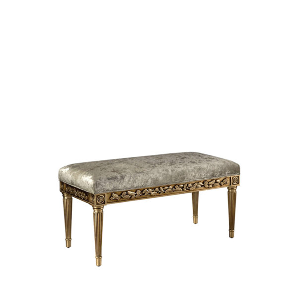 The versatile Maria bench can be used both as a seat and a foot rest. It is a fine example of classical design with a carved frieze of leaves and rosettes at the corners resting on carved fluted tapering legs.