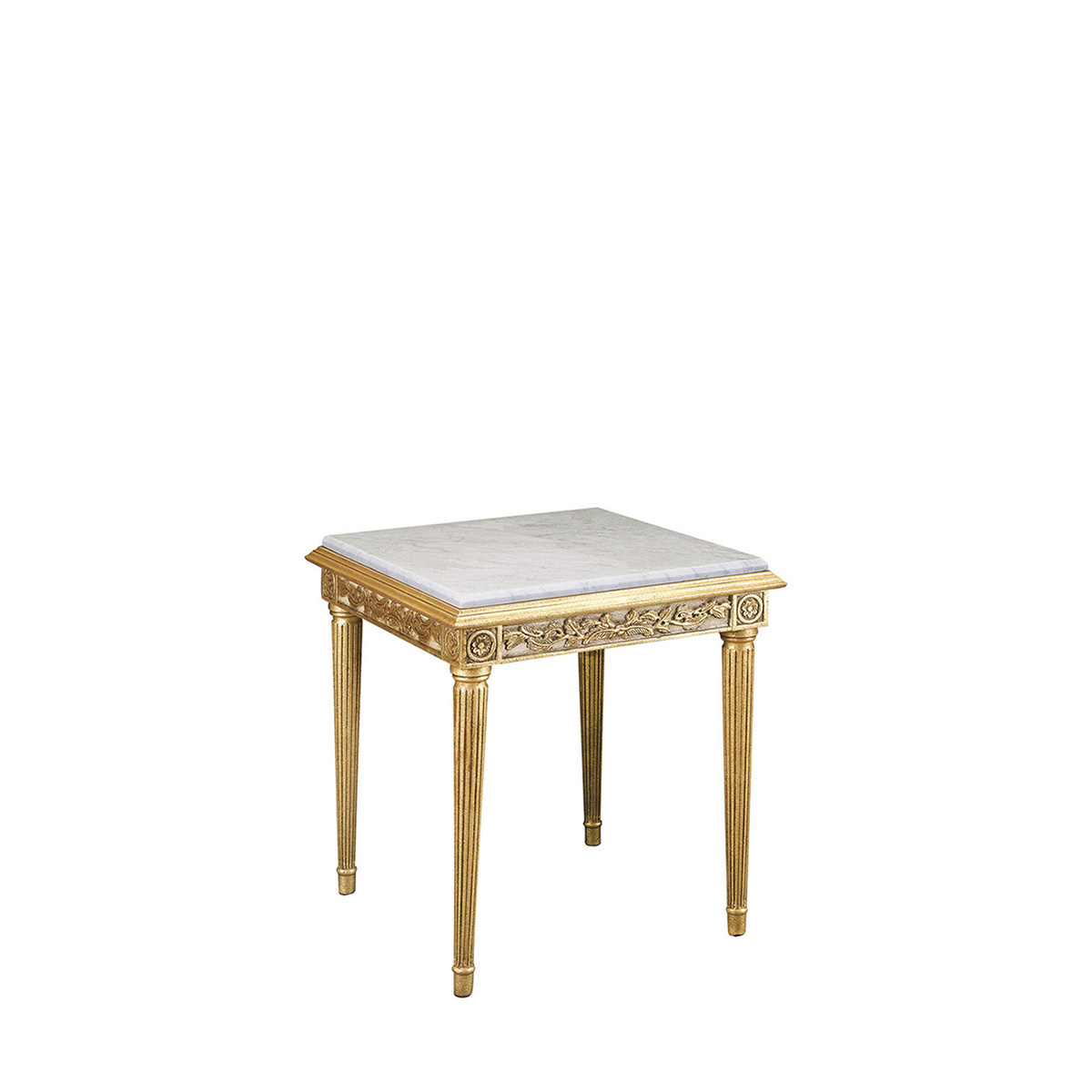 The Maria side table is a fine example of classical design with a carved frieze of leaves and rosettes at the corners. It rests on carved fluted tapering legs with a marble top available in various colours.