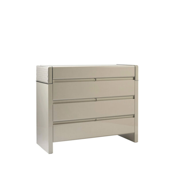 The Master chest of drawers with 4 drawers that is distinguished, as is the entire collection, by its elegant and refined lines. High-gloss lacquered surfaces in perfect harmony with embroidered leather and steel details. Choose from a multiple selection of lacquers and natural leather to create a unique piece.