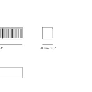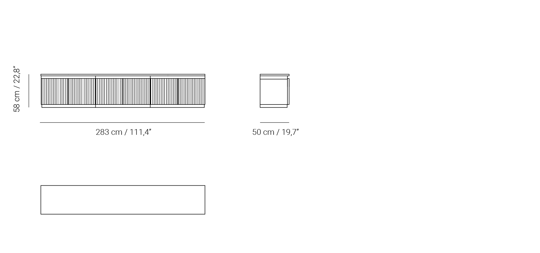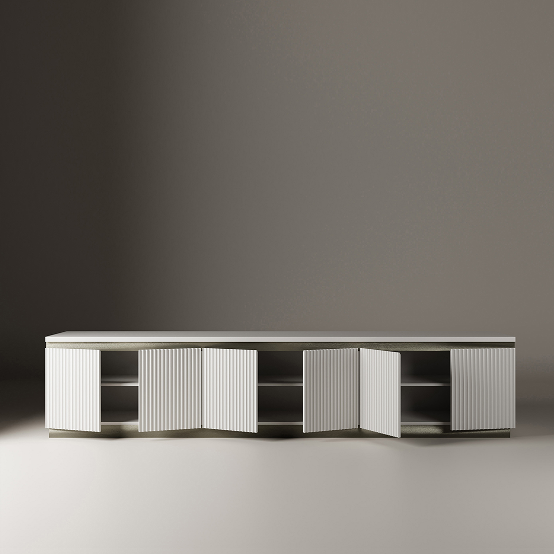The deep-ribbed front hides six doors highlighted by an elegant metal trim. With three satin lacquered finishes to choose from for the front and four different finishes for the base and details.