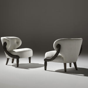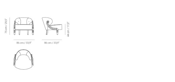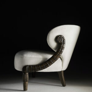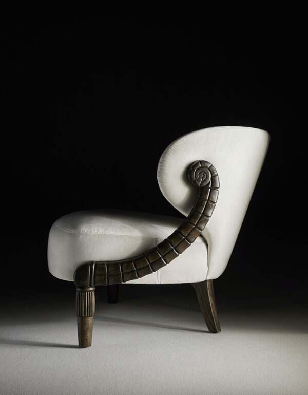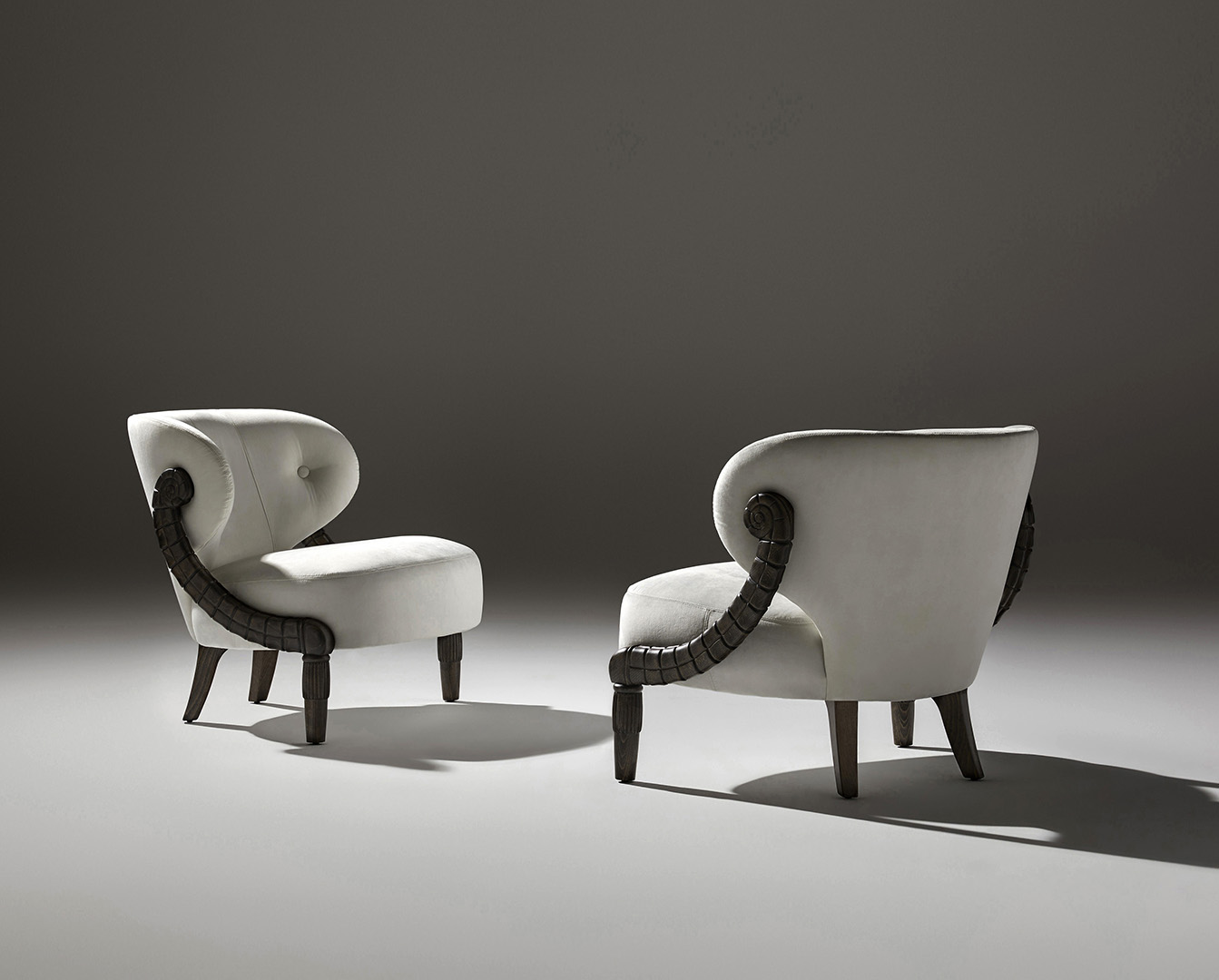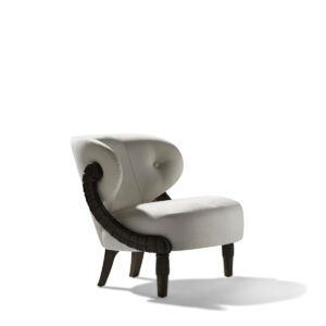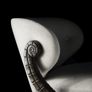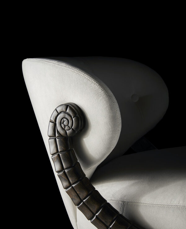 The elegant MONTESA armchair was destined to become an authentic icon of the firm. The striking feature of this piece resides in the ample seat in contrast to the subtly low seat back as well as the carved wooden structure fashioned in organic motifs.