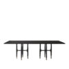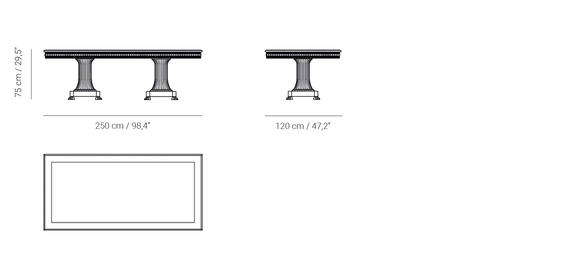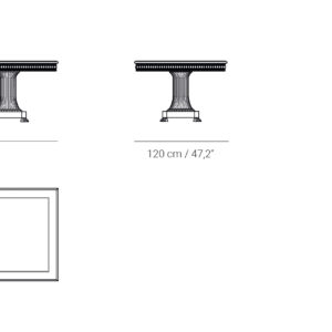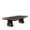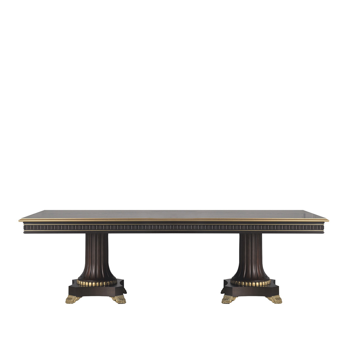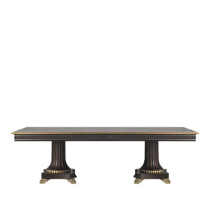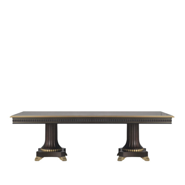 Sorbona is a classic rectangular table, ideal for both luxury dining rooms and shareholder boardrooms. Formed by an olive tree root top with an American walnut thread and a grooved border, it rests on two columns ending in a claw foot base.