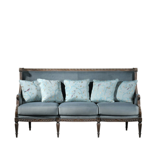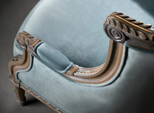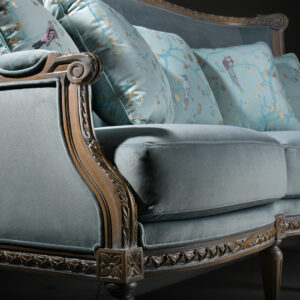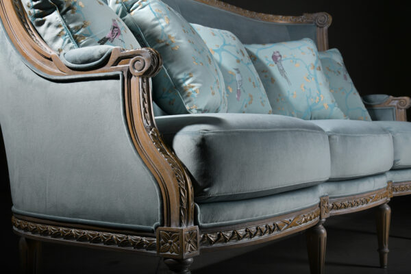 The elegant shape of the Susa 3-seater sofa is inspired by the French bergère pieces with upholstered backrest, seat and armrests. The large seat cushion provides extra comfort. The wooden frame is exposed to view and has been carved by hand with classic ornamental motifs. Combine with the Susa armchair to create cosy lounges or classic reception rooms.