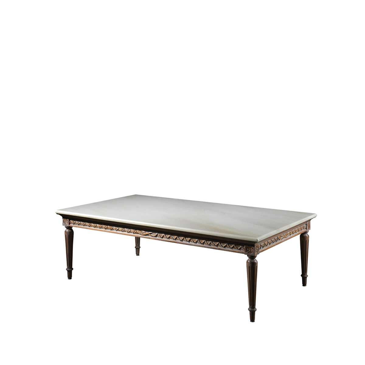 The classic style Susa rectangular coffee table consists of a handcrafted carved wooden base with tapered legs and a marble top. Combine the wood finish with the different marble options to create a unique piece that adds a personal touch to your décor.