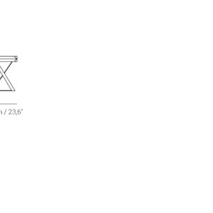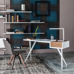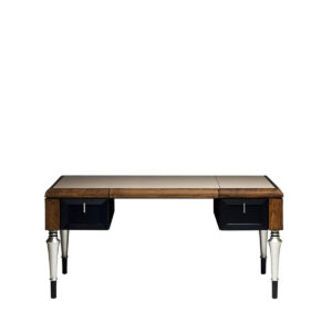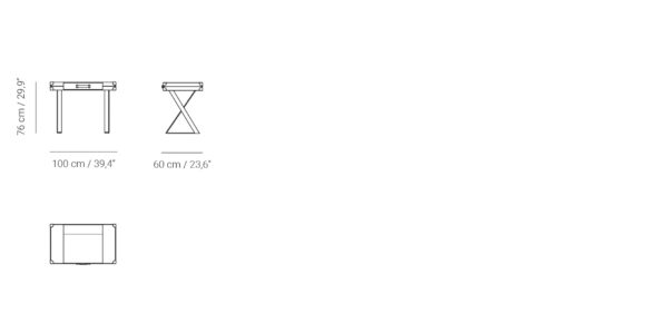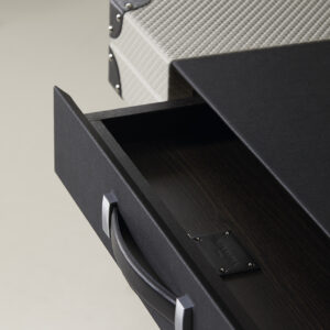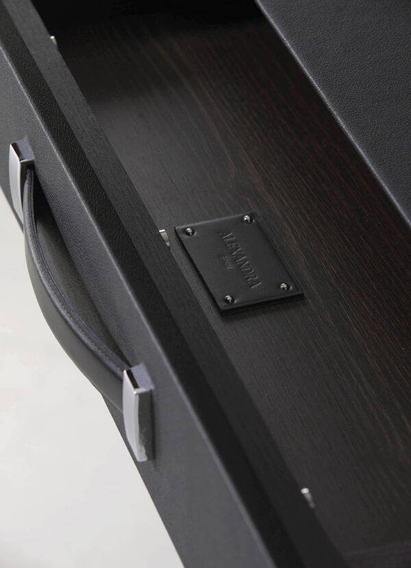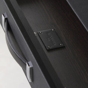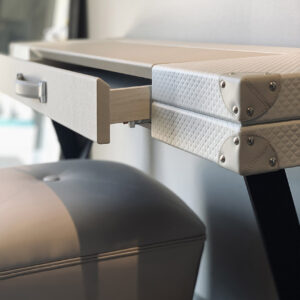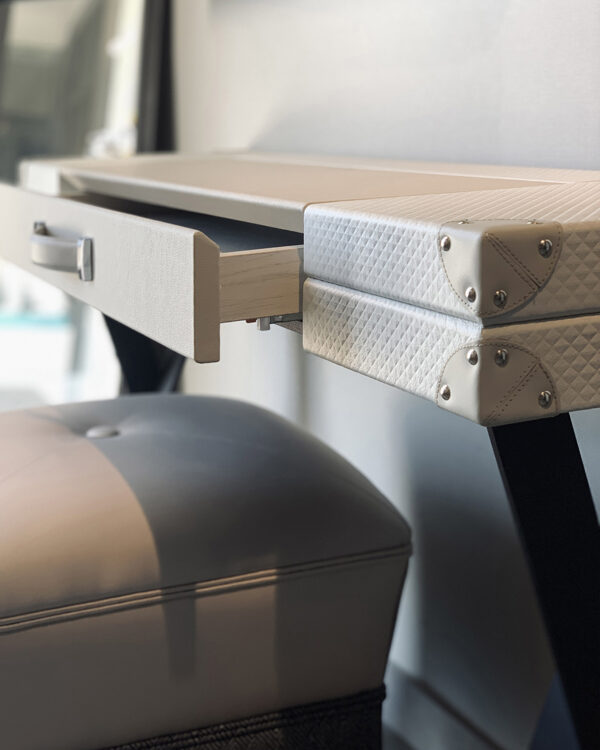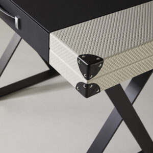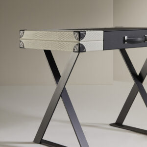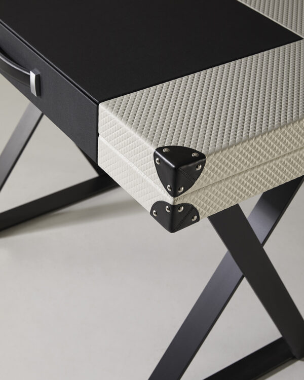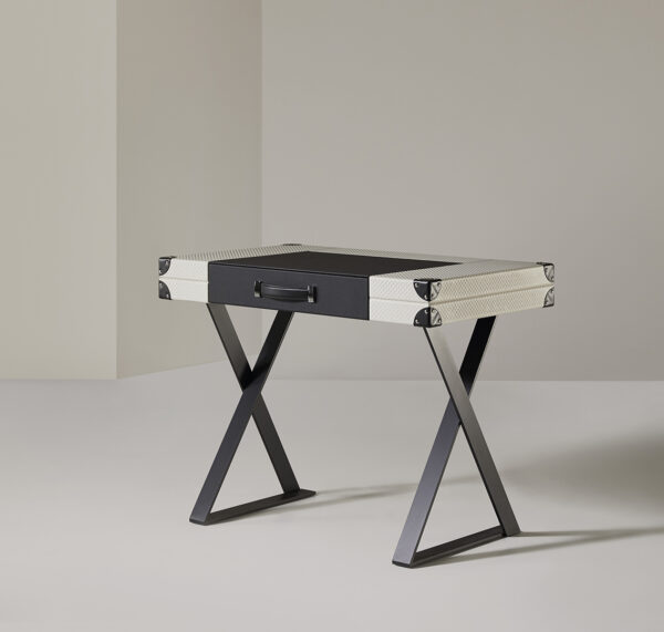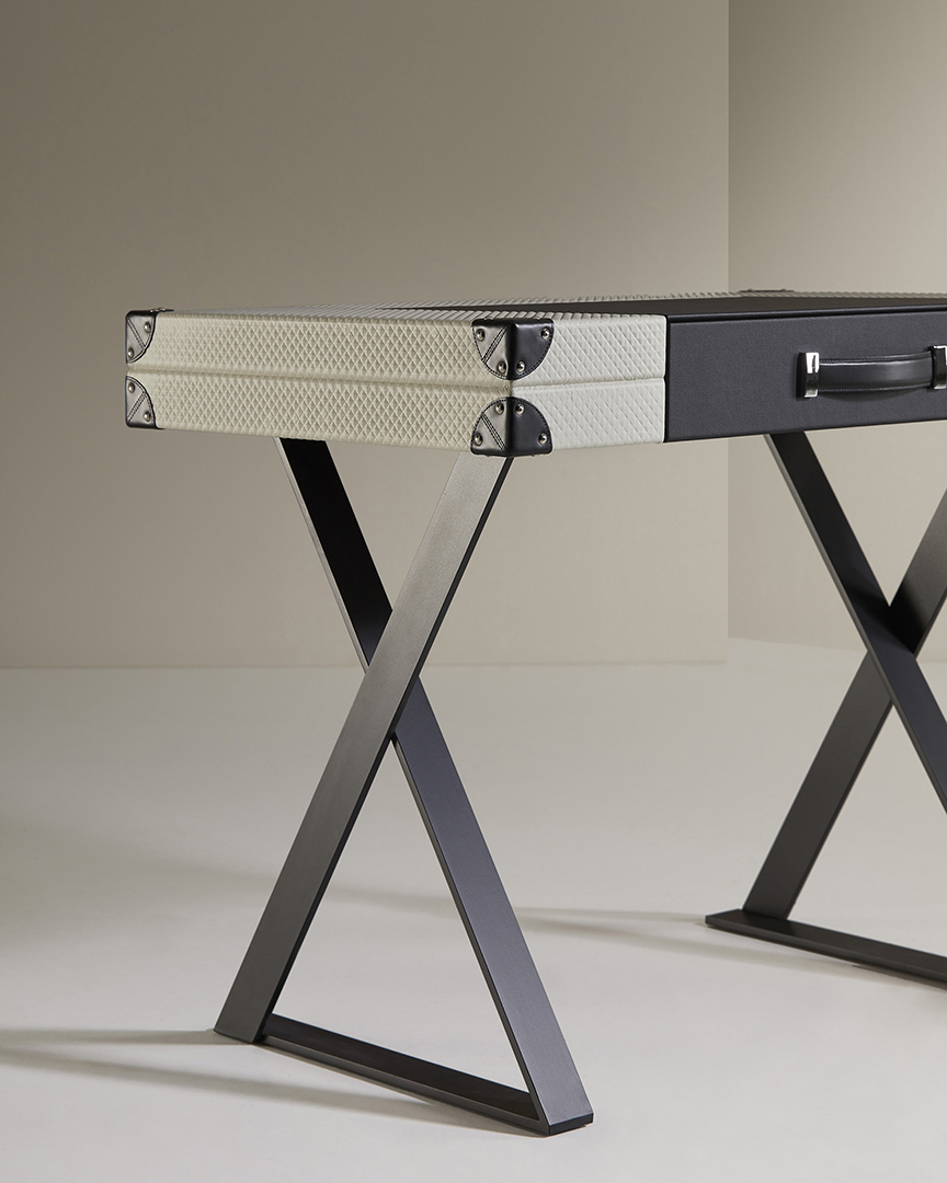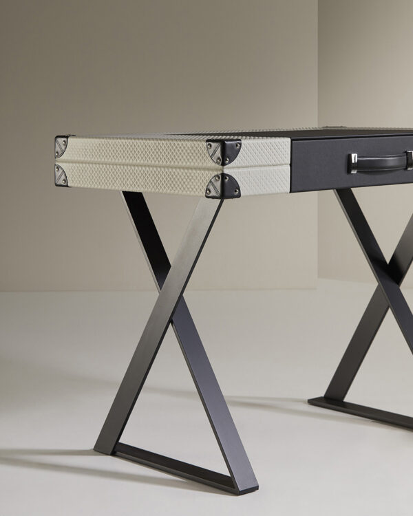 The top of the desk is inspired by vintage travel suitcases. Lined in embossed natural leather available in more than 40 colours and the top in smooth eco-leather in a wide range of shades. Carefully detailed, such as the leather corner protectors finished with push pins or the leather strap-shaped handle. It has a discreet central drawer for a basic writing set. The base is formed by two metal legs in the shape of a cross, for which we recommend the standard textured black finish.
