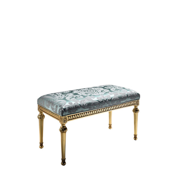 The Versalles bench is elegantly classic with an upholstered seat framed by a carved wood border and ornate legs.