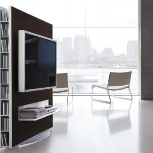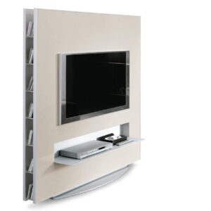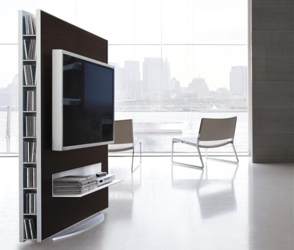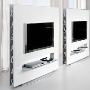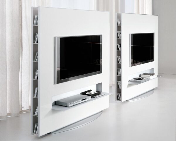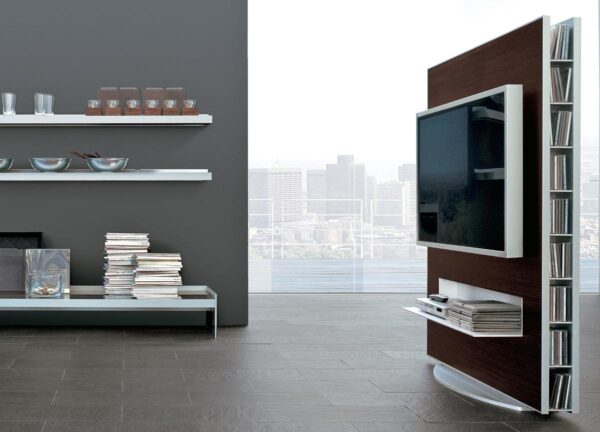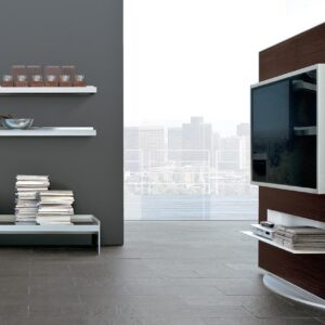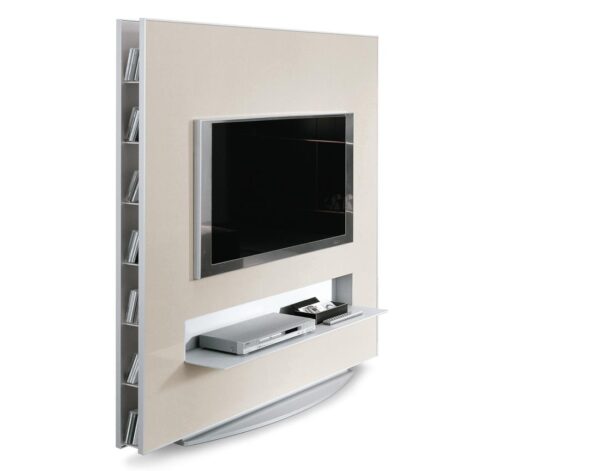 This TV unit from Alivar furniture is a large, high end TV unit with built in cable management and a fluorescent light, fully made in Italy. This TV unit comes with a steel painted aluminum base and aluminium shelf.