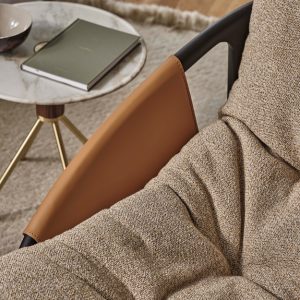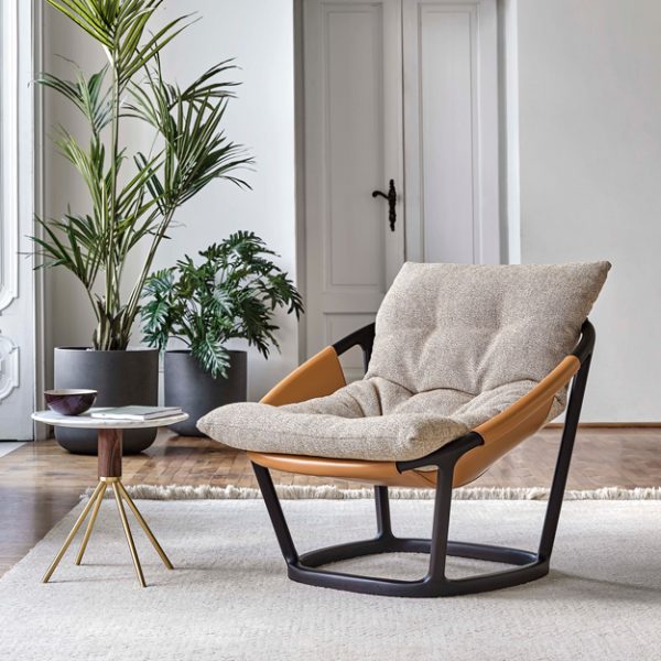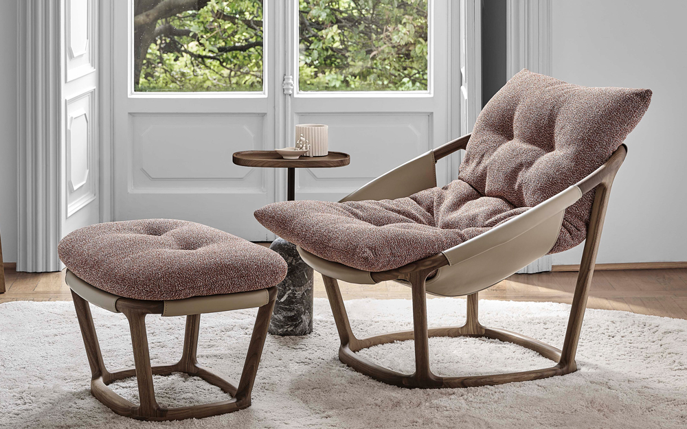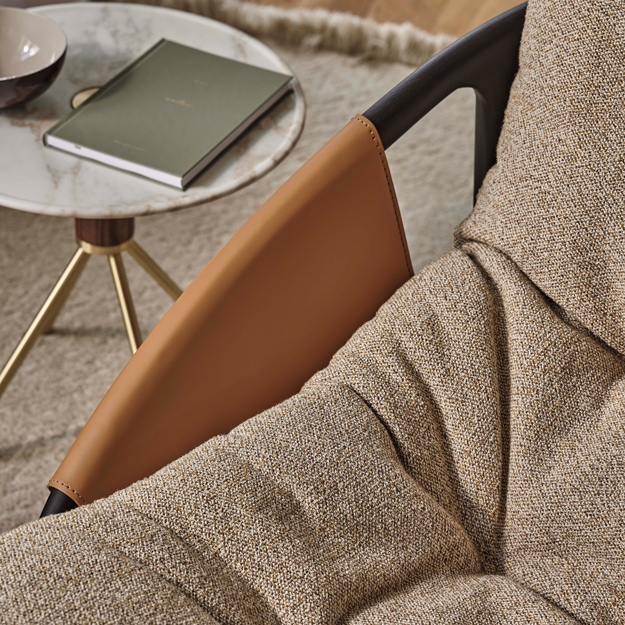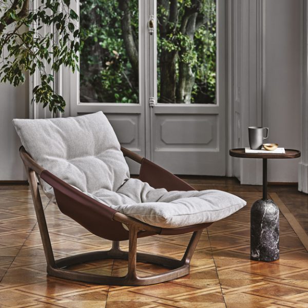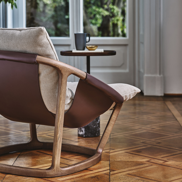 Unique and distinctive, the Amarantha armchair by Porada features a curved solid canaletto walnut frame with a hammock-inspired seat and backrest support in a cuoietto regenerated hide leather finish. This is paired with a tufted seat and backrest cushion filled with polyester fibre and polyurethane inserts, finished with removable covers available in a variety of fabric finishes.