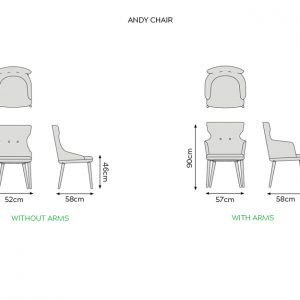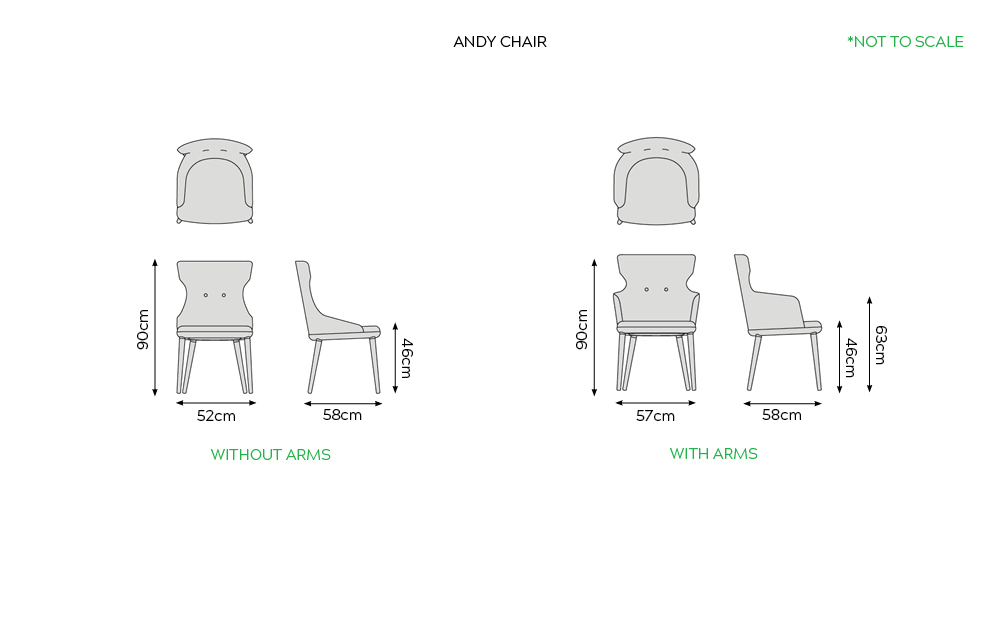 With Arms – W: 57cm D: 58cm H: 90cm, Seat H: 46cm, Arm H: 63cm