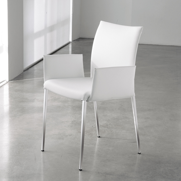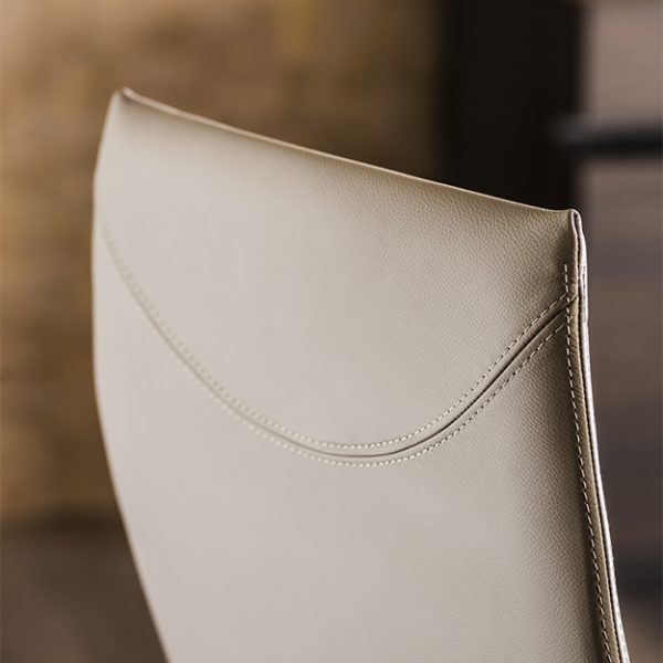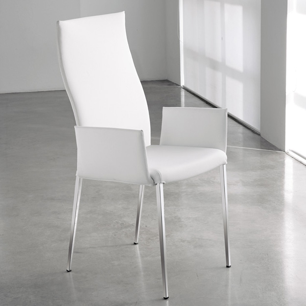 The Anna Chair With Arms can be selected with either a high or low back. The wave-inspired upholstered backrest features an elegant curve that is complemented with upholstered armrests and can be selected in a choice of synthetic leather or real leather finishes. The look is completed with fluted metal legs.