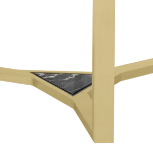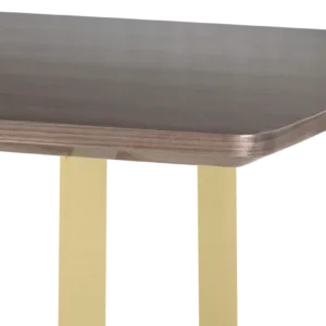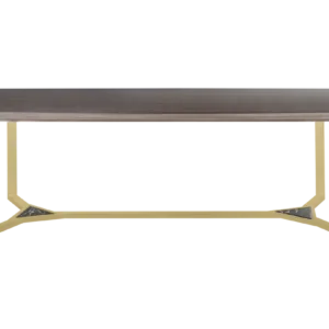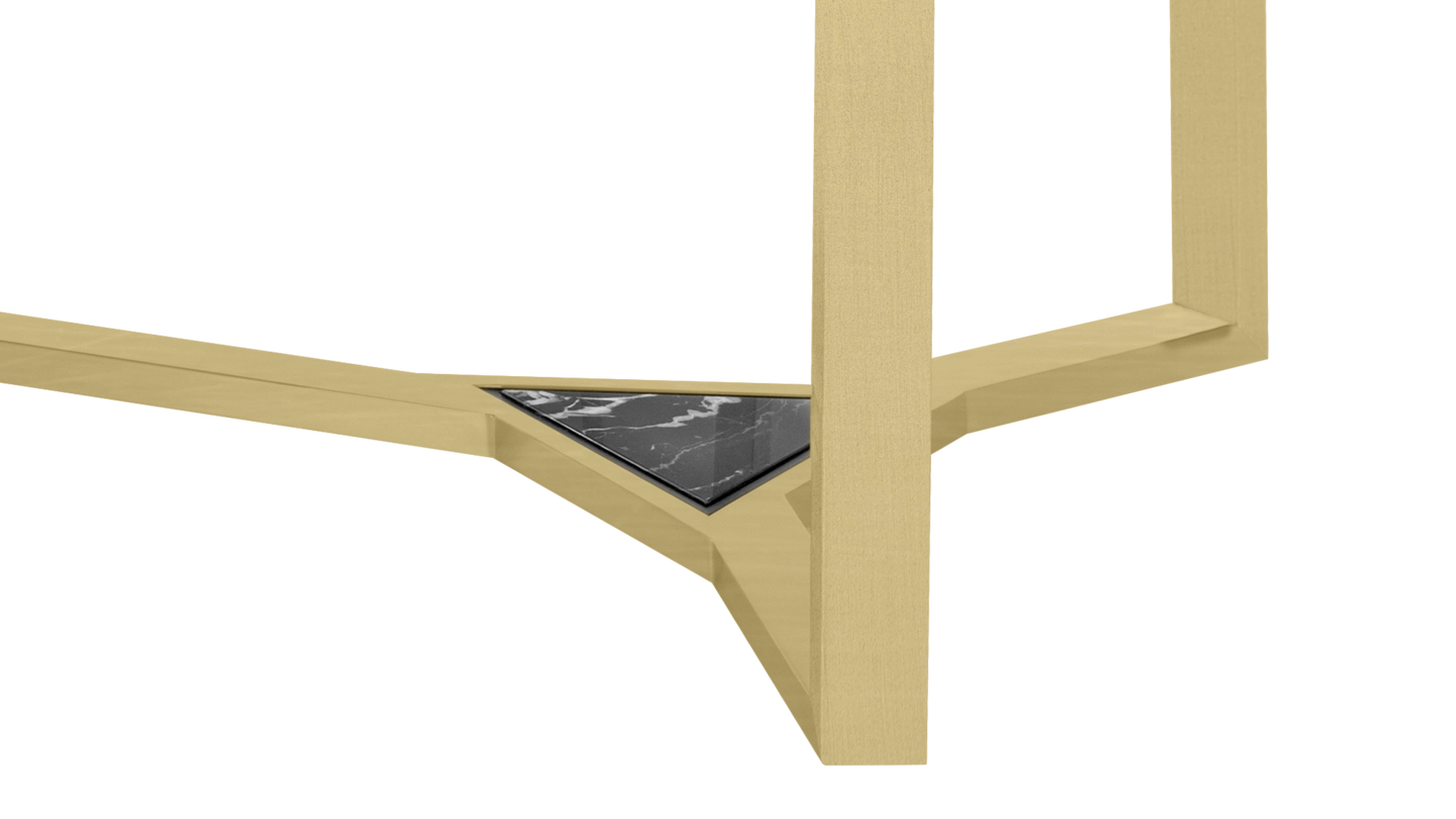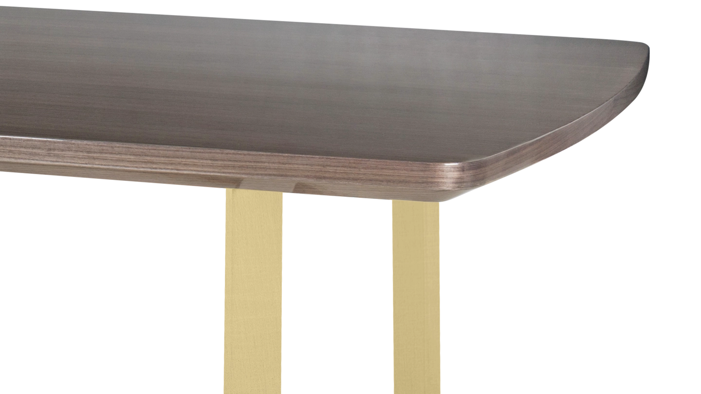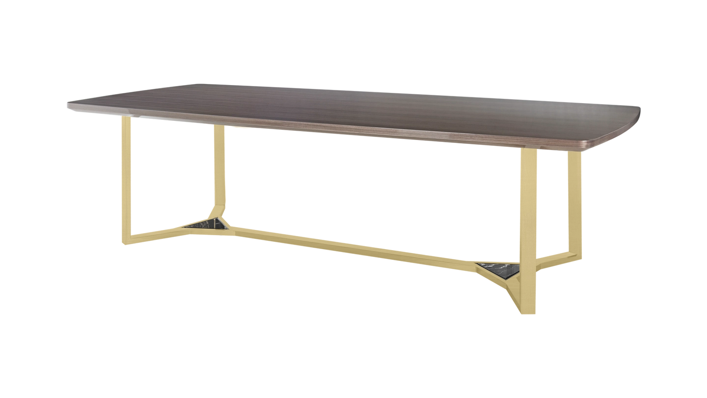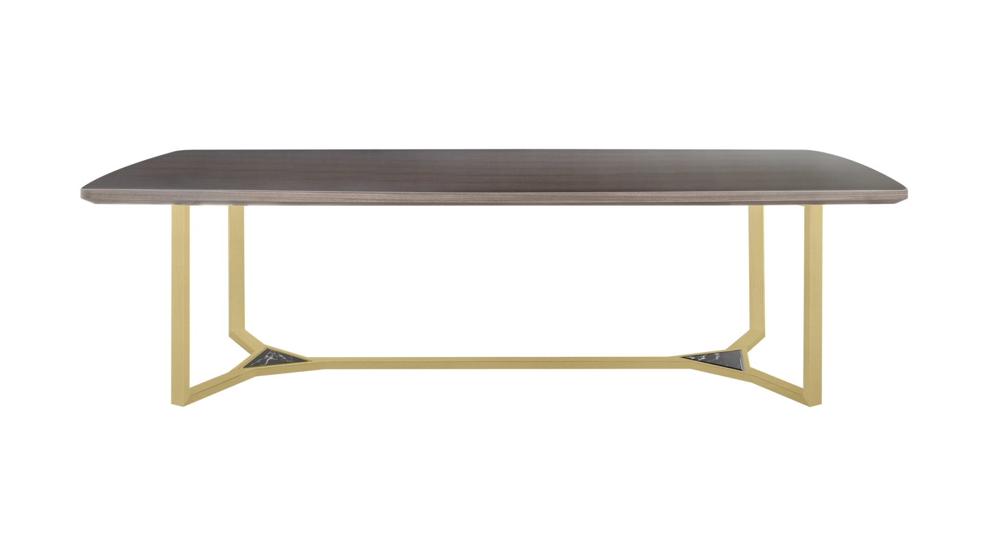 Pairing a streamlined, wood veneer top with a stunning brushed-brass frame, the ARENDAL Dining Table adds a final flourish at the base, where the curious will discover two inlaid triangles of stone edged in veneer.