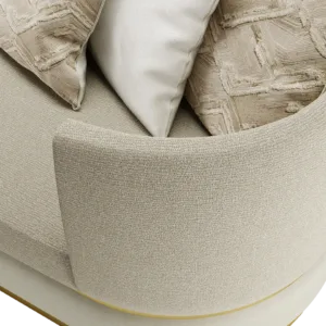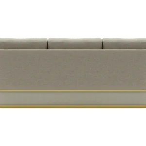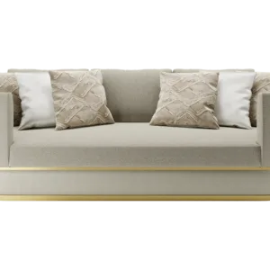 The AREZZO sofa, distinguished base with a band of contrasting woven fabric that is inserted between two strips of brushed brass, with cushioned arms and upholstered in lush velvet, envelop the sitter, providing unparalleled comfort.