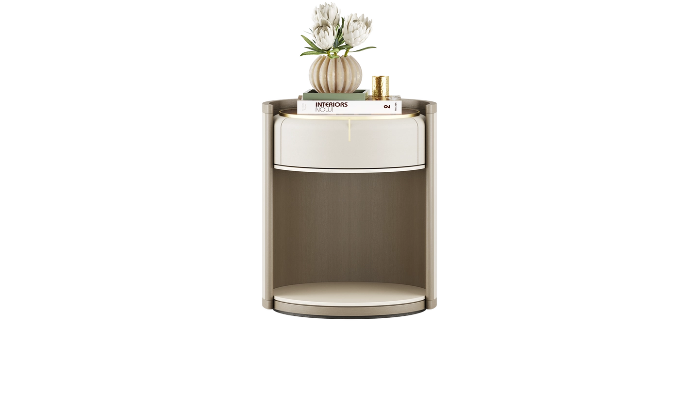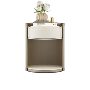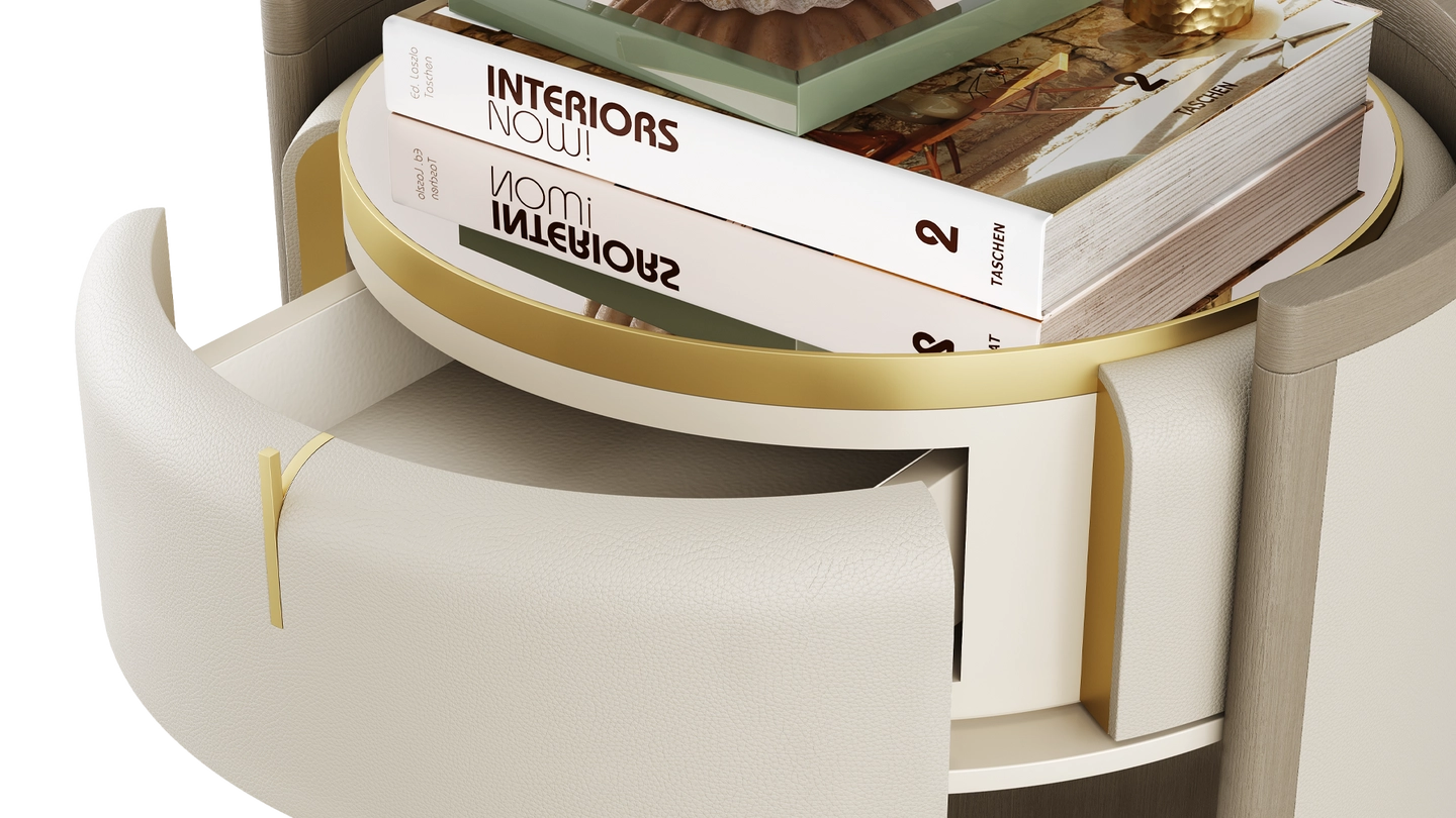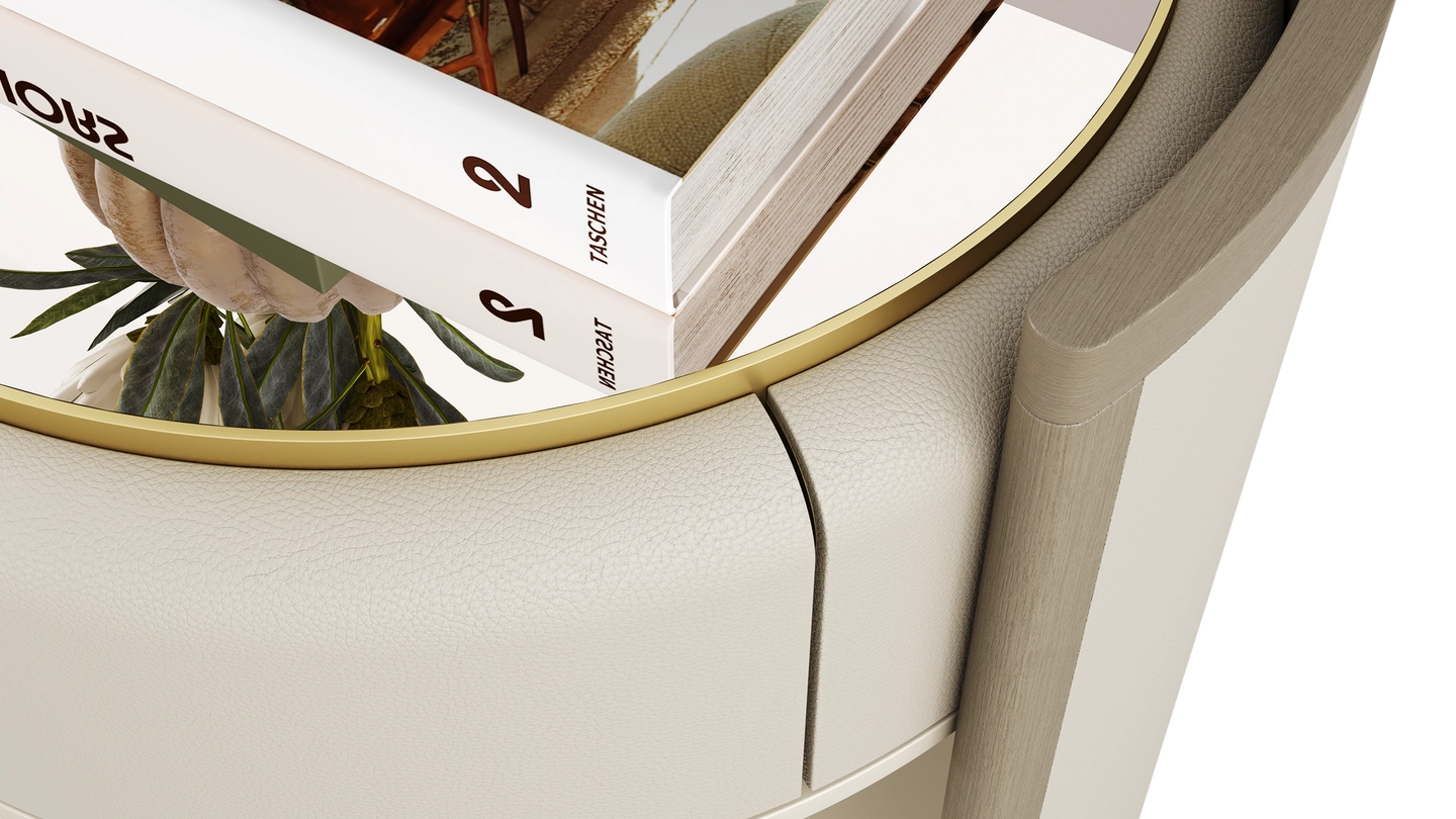 Elevate your bedroom with our ARLES Bedside Table. The curved shape is simple but striking, combining lacquered wood and leather, while the bronze mirror top brings a touch of elegance.