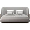 The stylish and modern ASHI Bed features a streamlined headboard and exterior upholstered in restful grey linen. At the base, a sculptural platform crafted from black lacquer and brushed brass adds unexpected impact and drama.