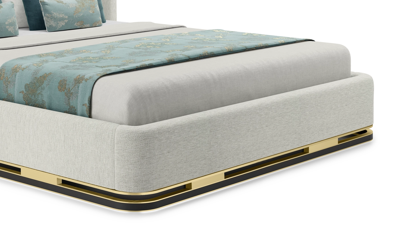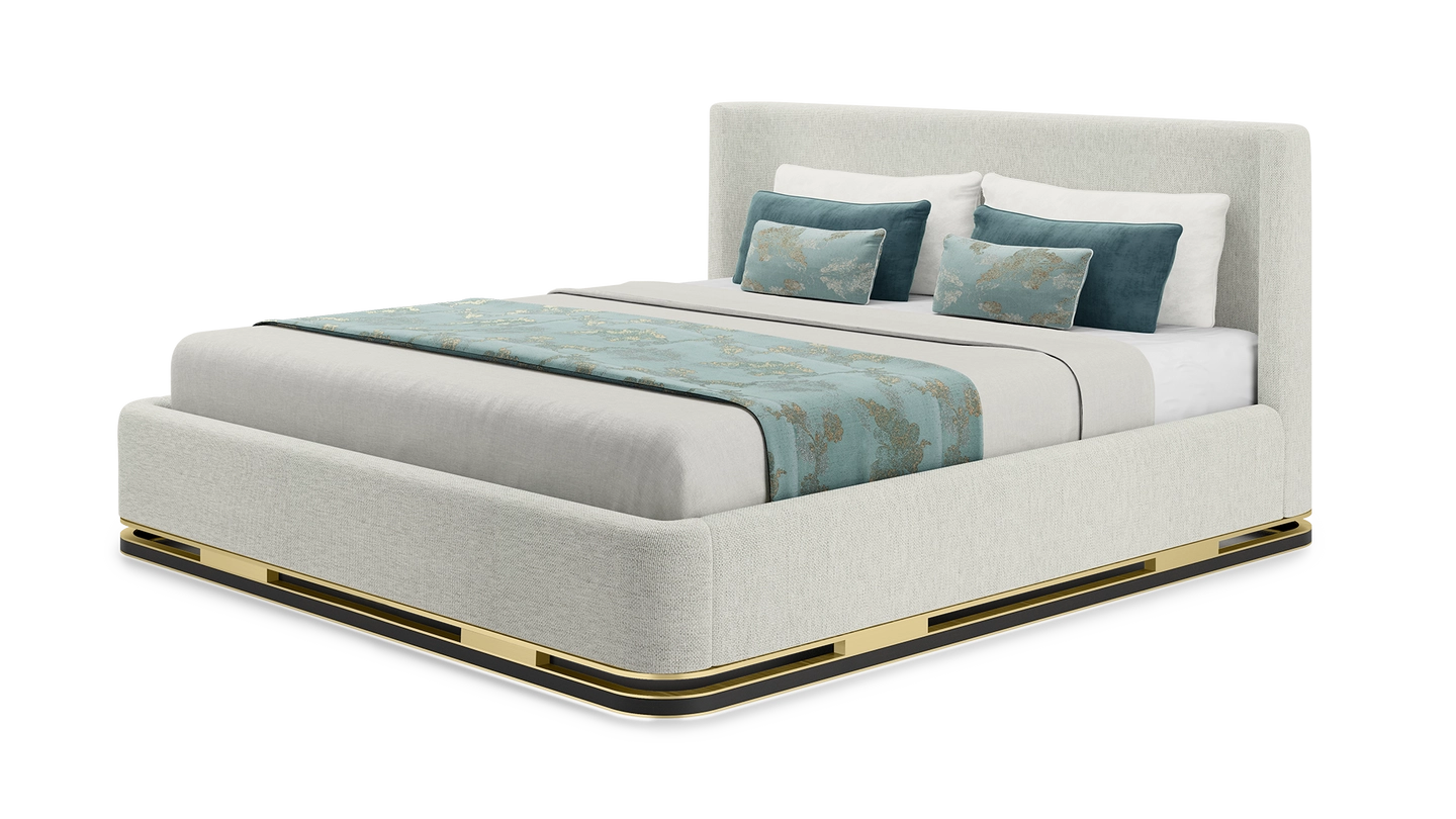 The stylish and modern ASHI Bed features a streamlined headboard and exterior upholstered in restful grey linen. At the base, a sculptural platform crafted from black lacquer and brushed brass adds unexpected impact and drama.