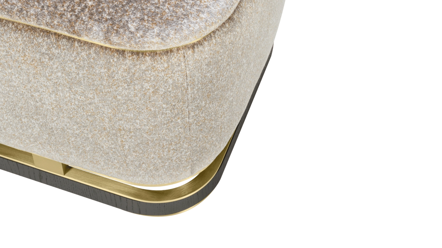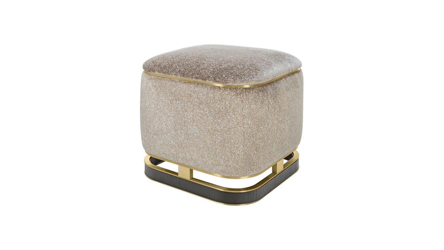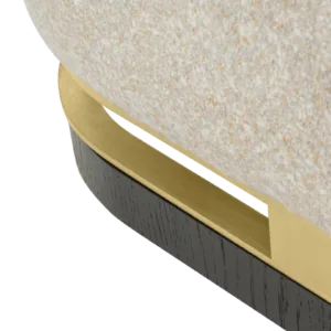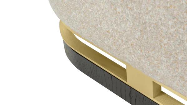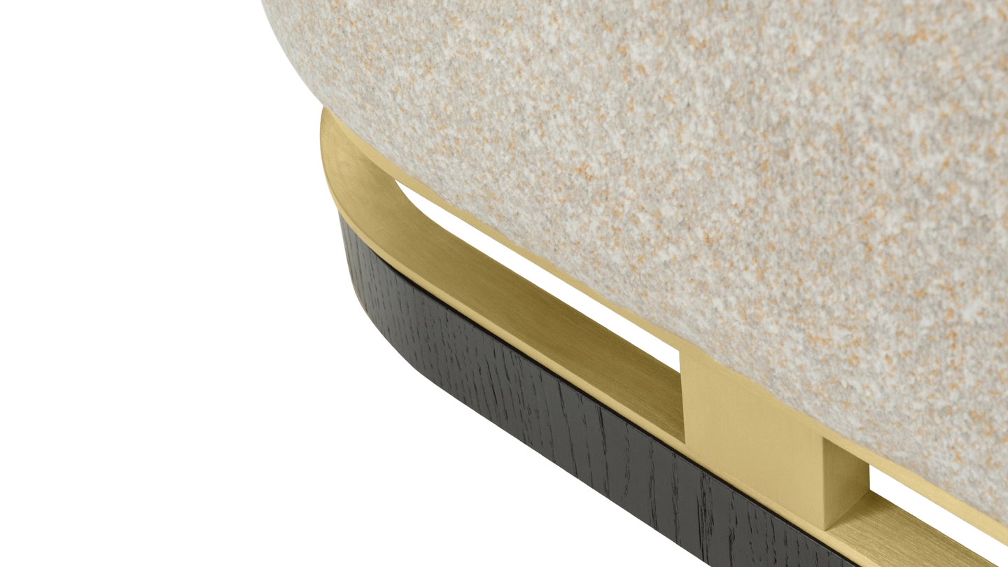 The design of the upholstered ASHI stool is elevated by a sculptural base crafted from wood veneer and brushed brass.