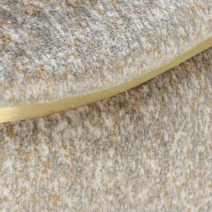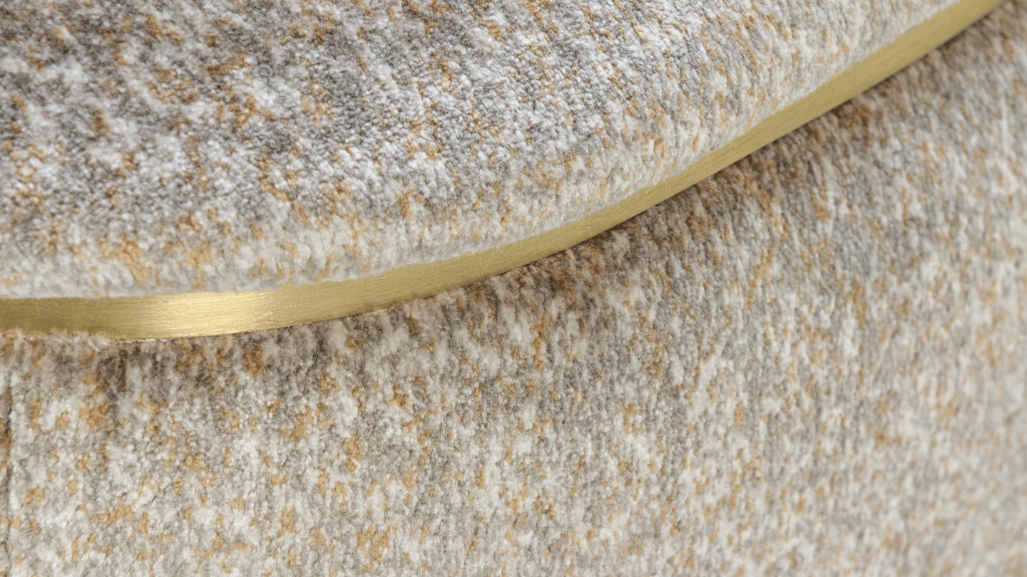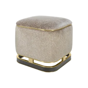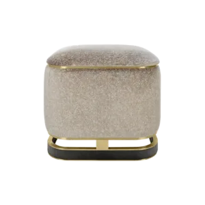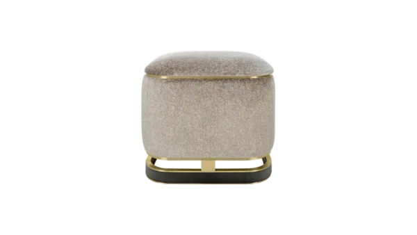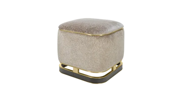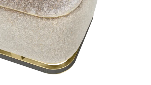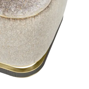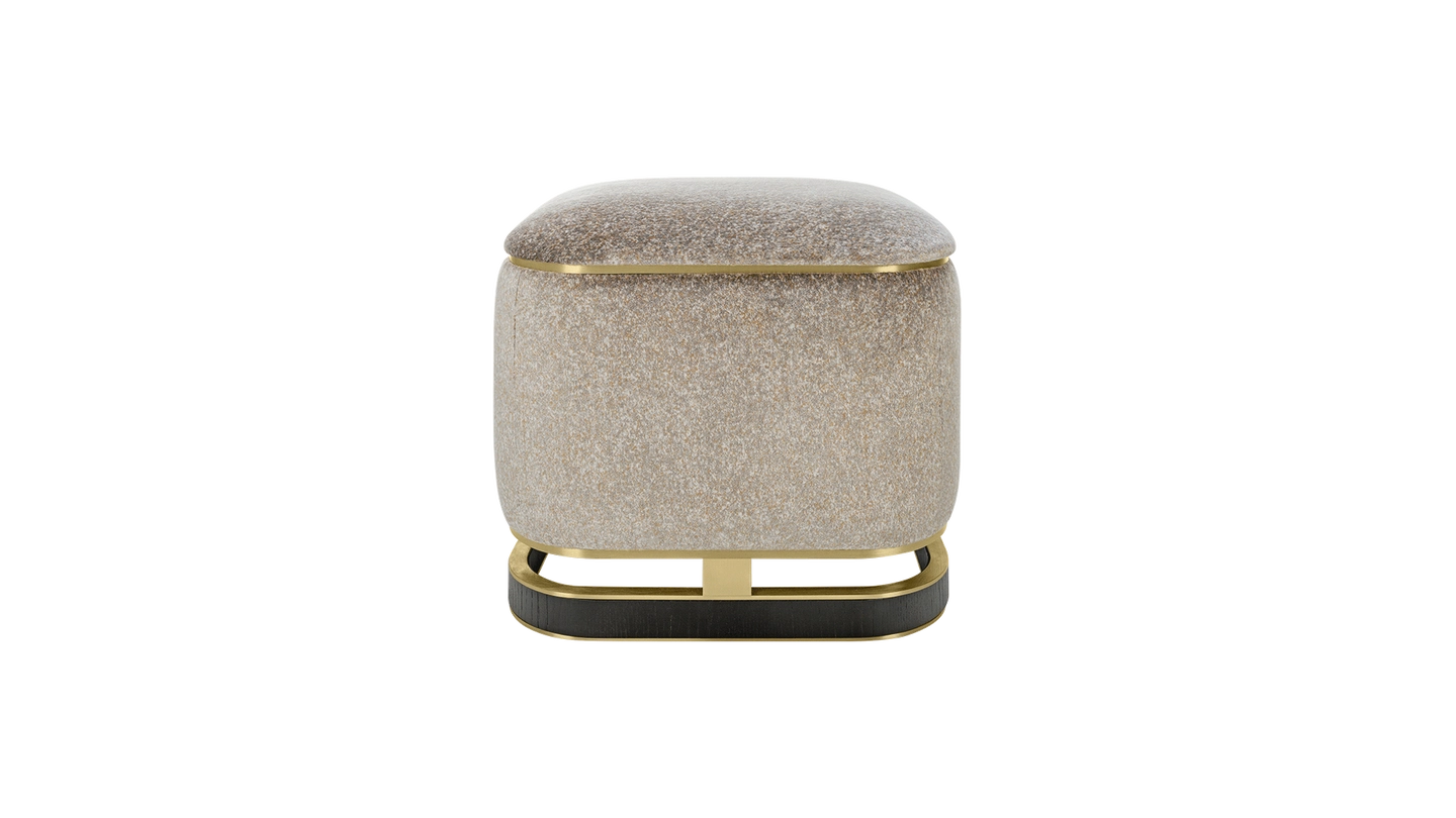 The design of the upholstered ASHI stool is elevated by a sculptural base crafted from wood veneer and brushed brass.